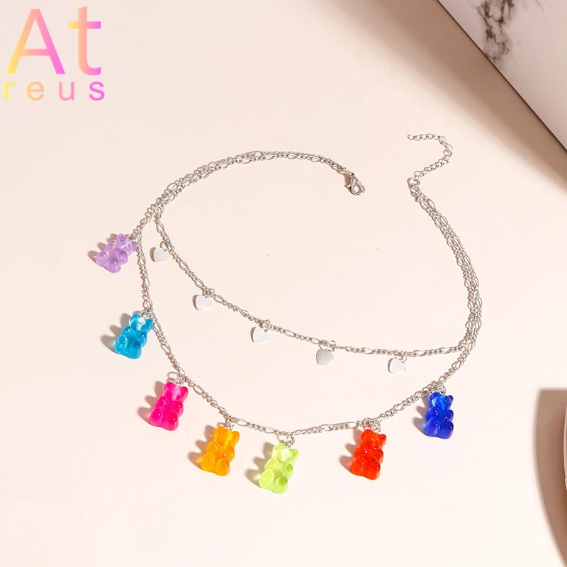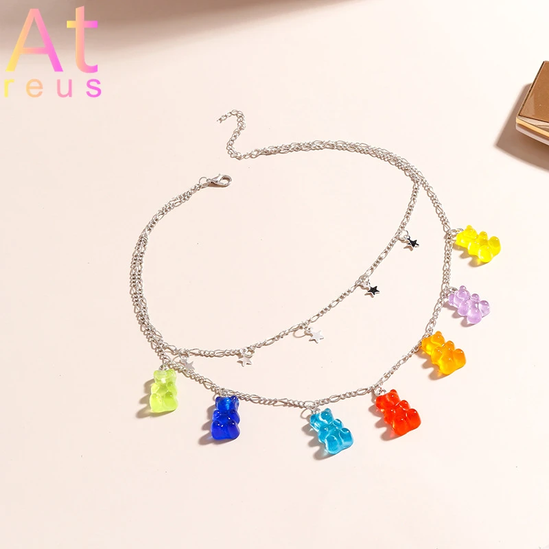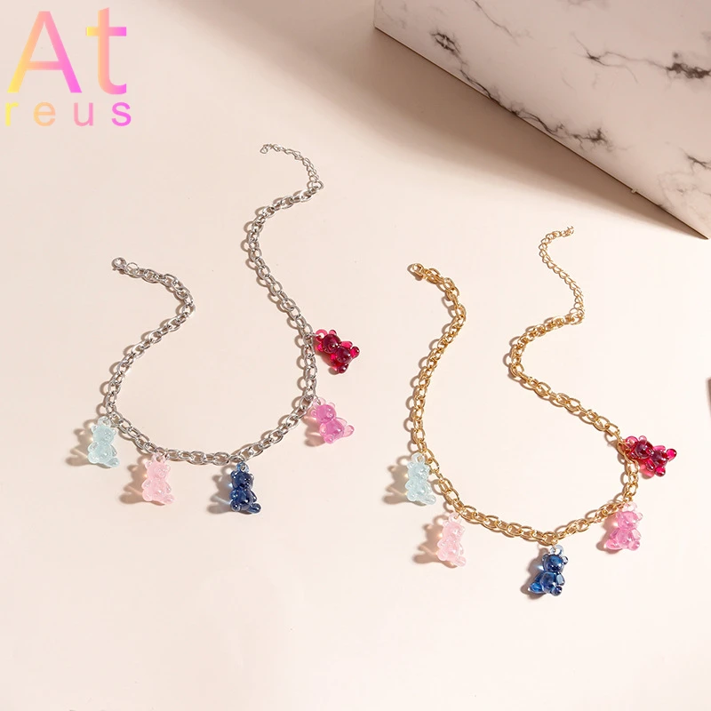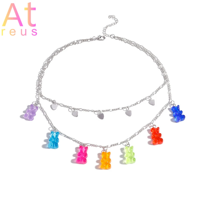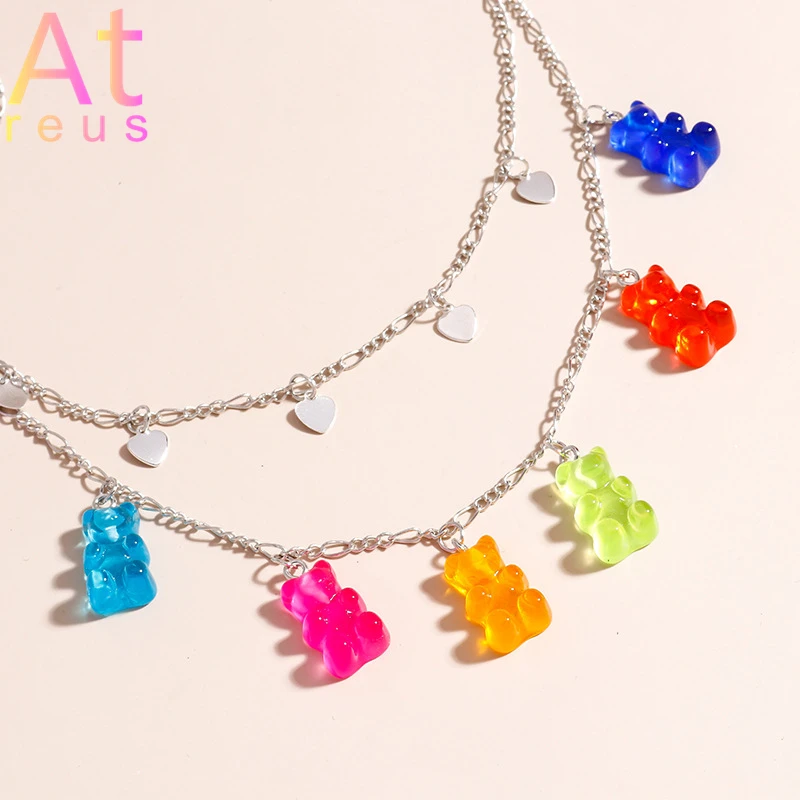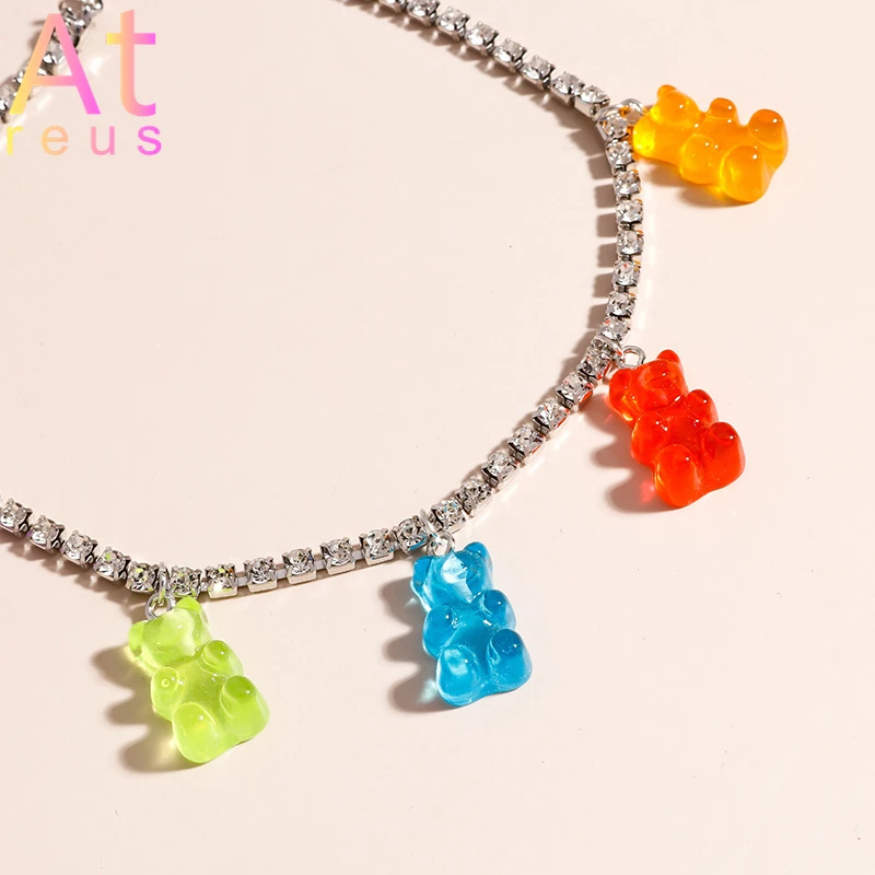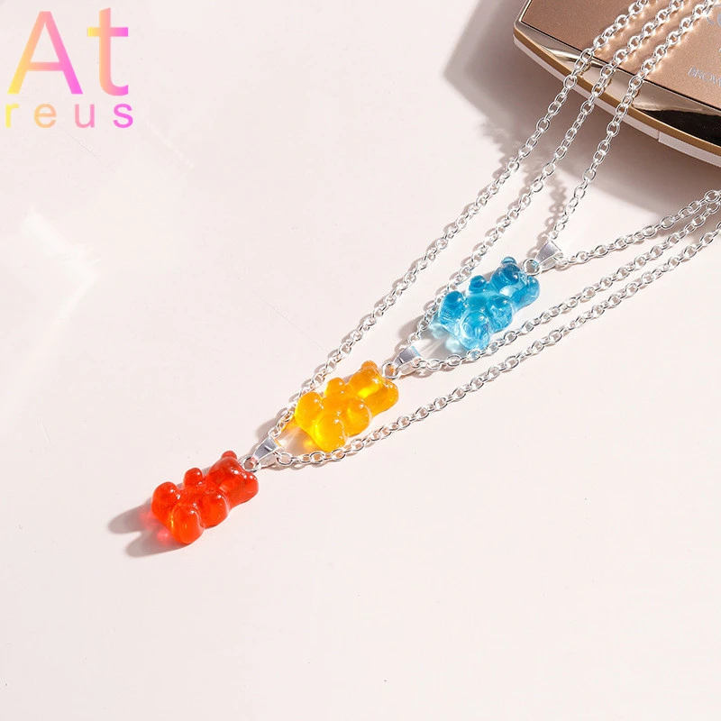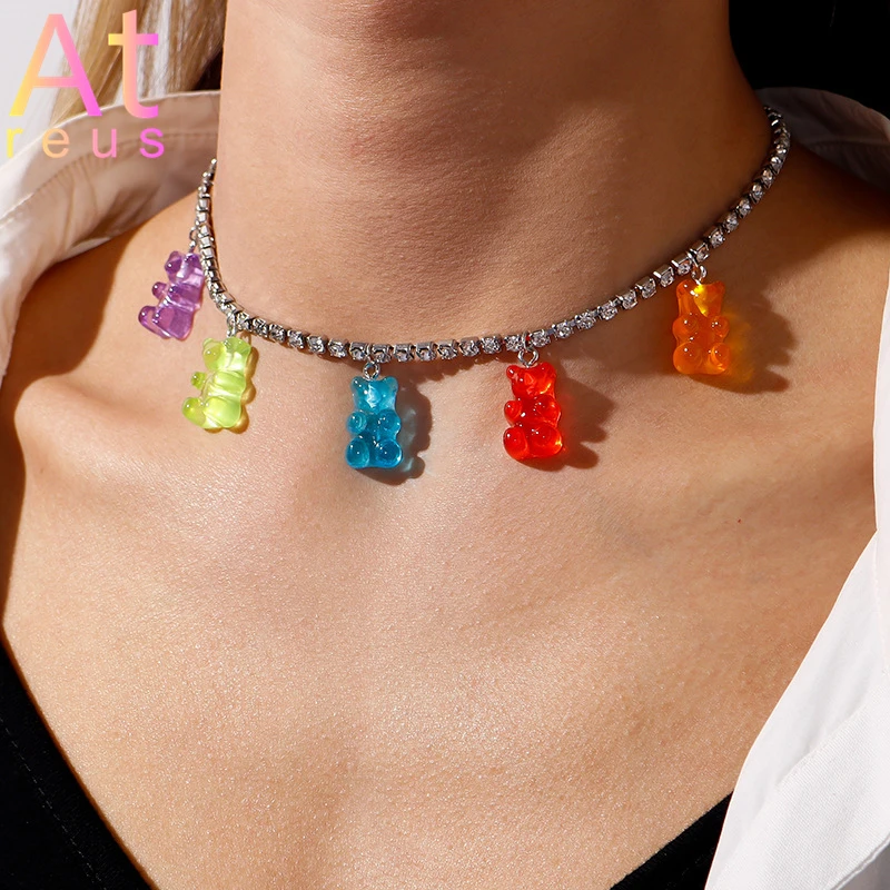 Pink Plastic Resin Chain Colorful Cartoon Gummy Mini Bear Resin Necklace Candy Color Pendant For Women Girl Jewelry Gift