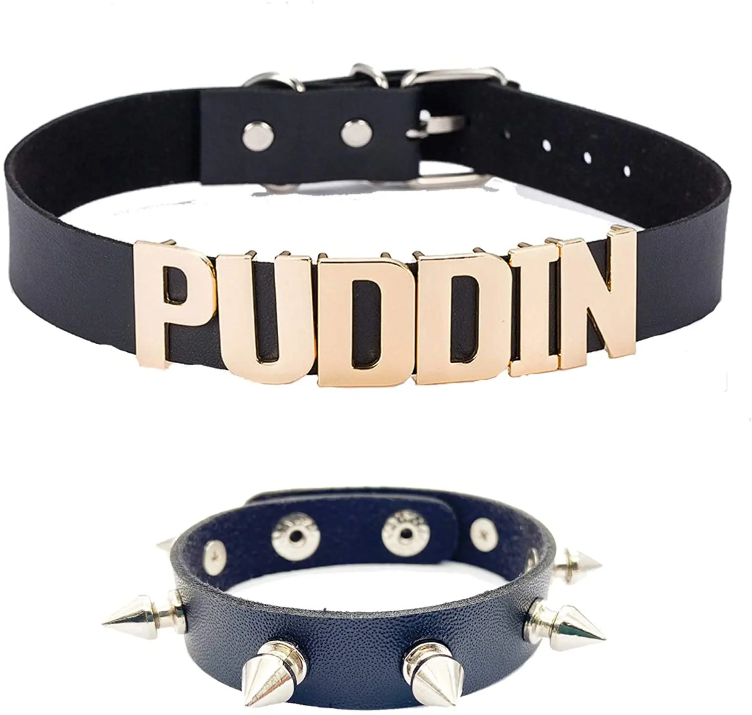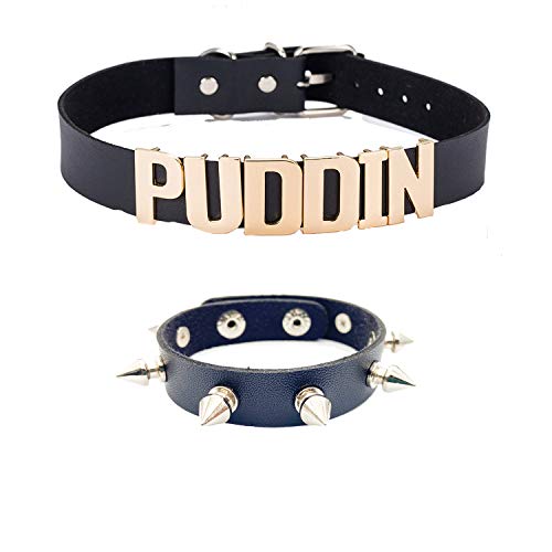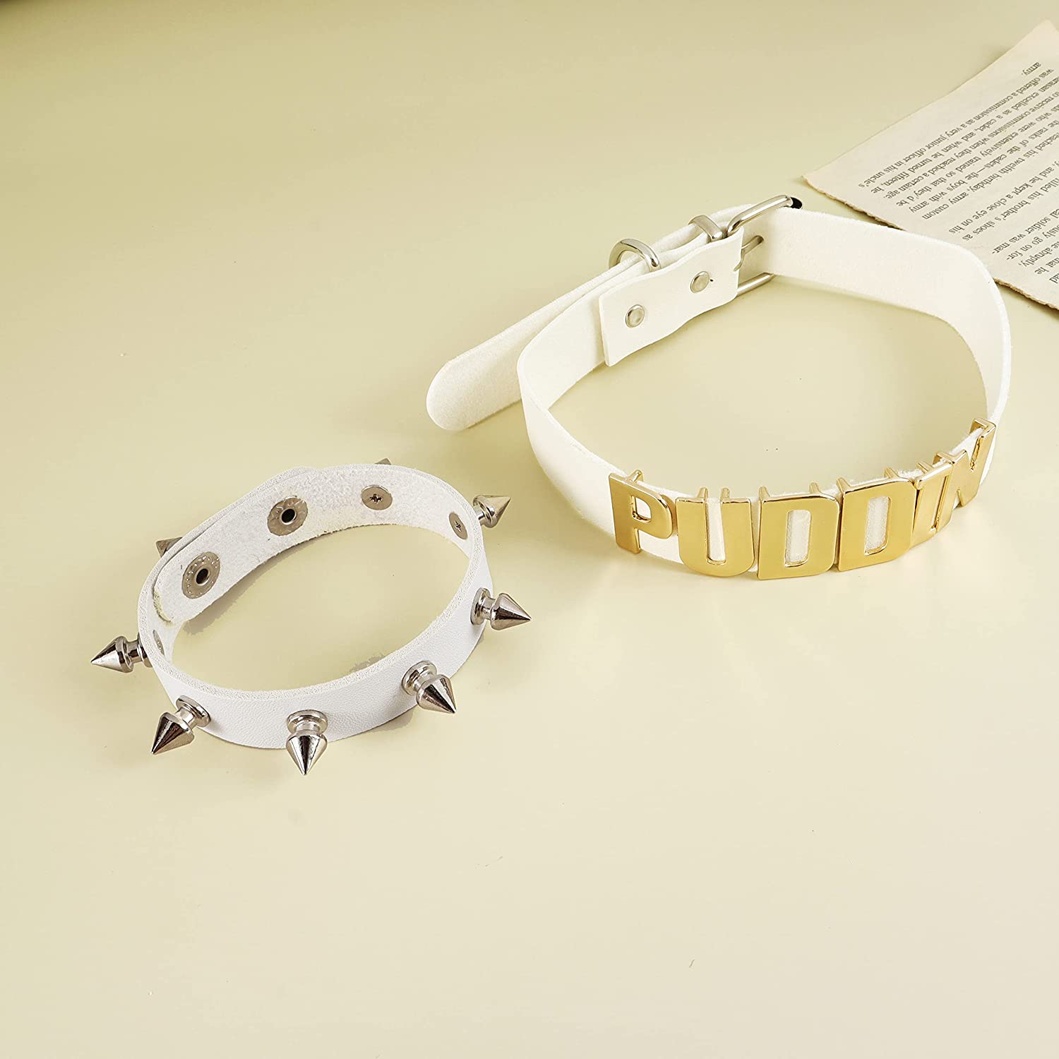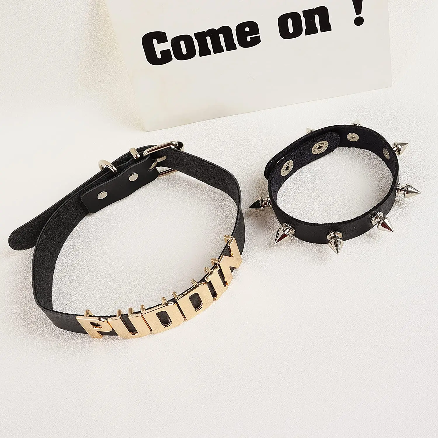 Puddin Necklace Rivets bracelet for Women Leather Choker Necklace Cosplay Choker Letter Collor Cosplay Accessory Halloween Party