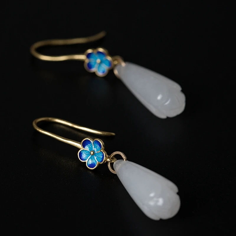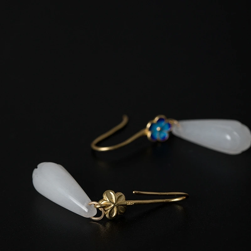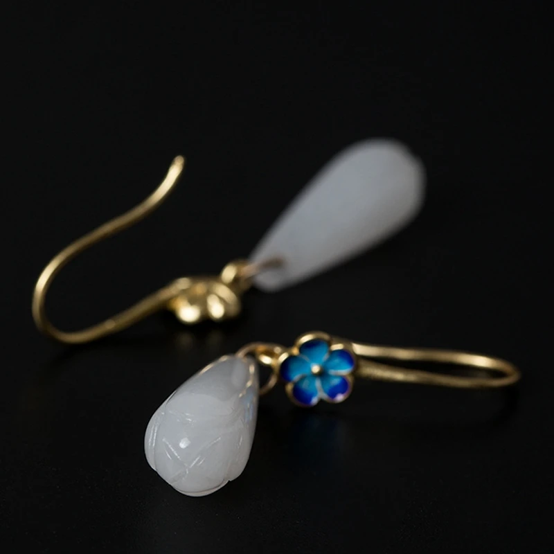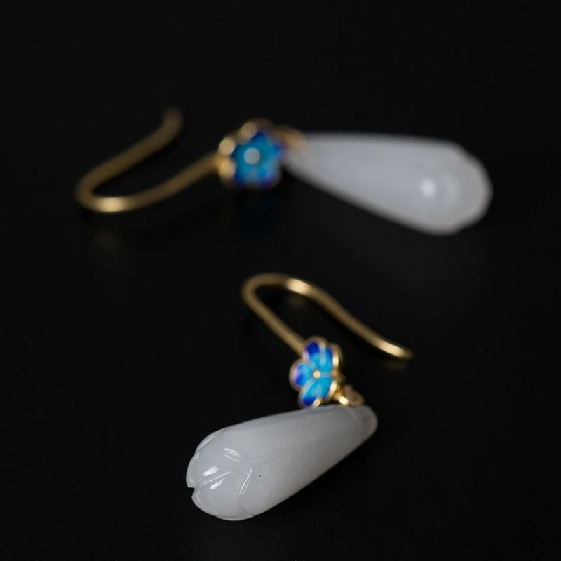 Pure white jade magnolia enamel earrings 925 sterling silver drop earrings noble temperament simple design vintage women jewelry