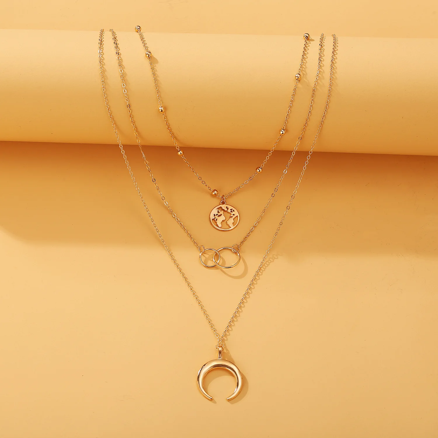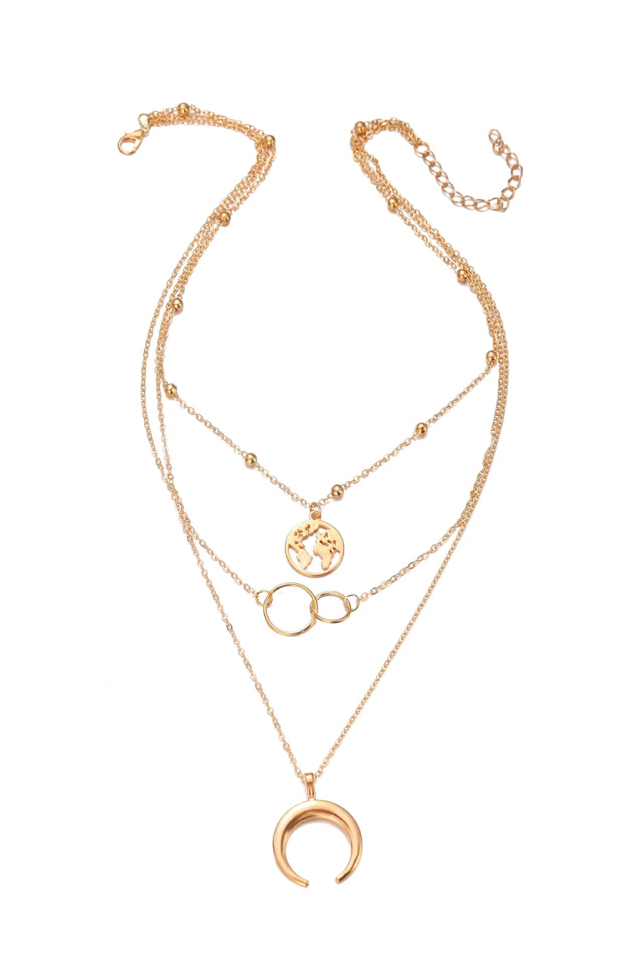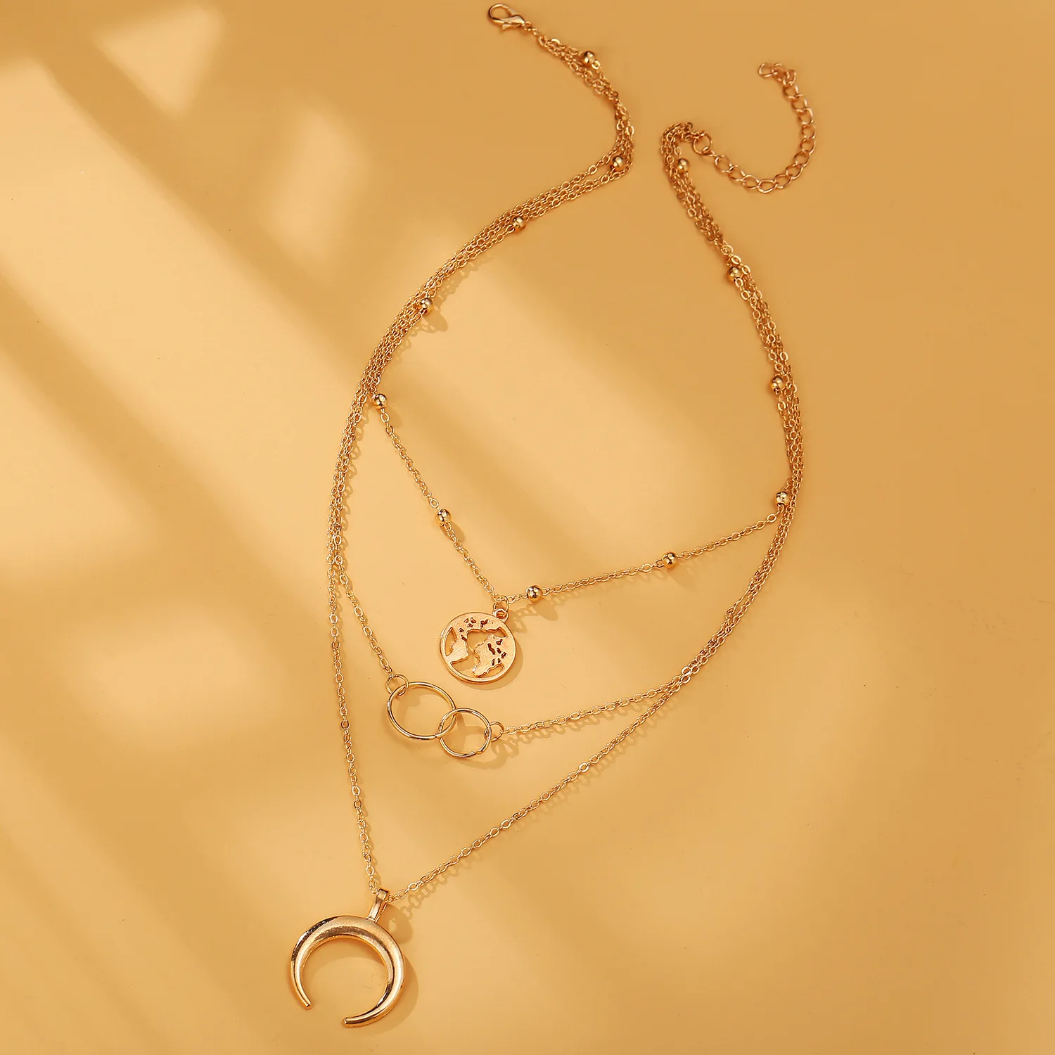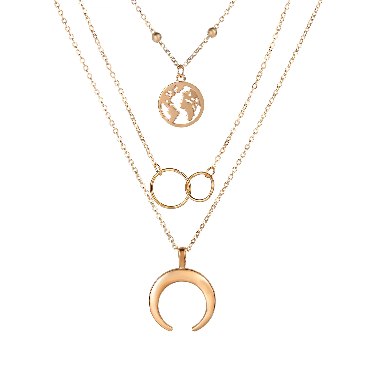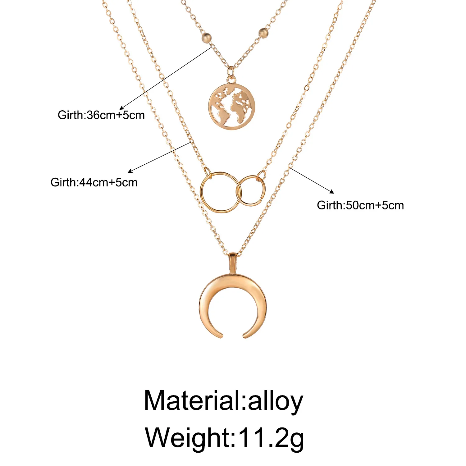 Retro Moon World Map Circle Pendant Multilayer Gold Colodr Necklace Party Charm Jewelry Accessories For Women
