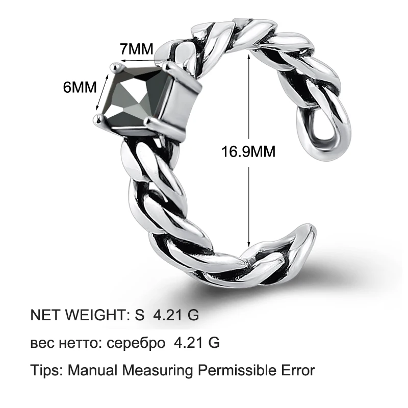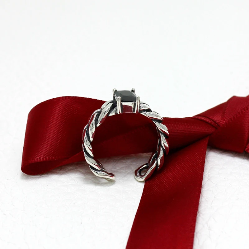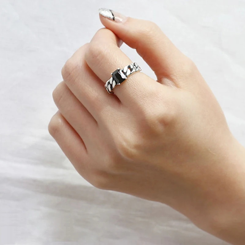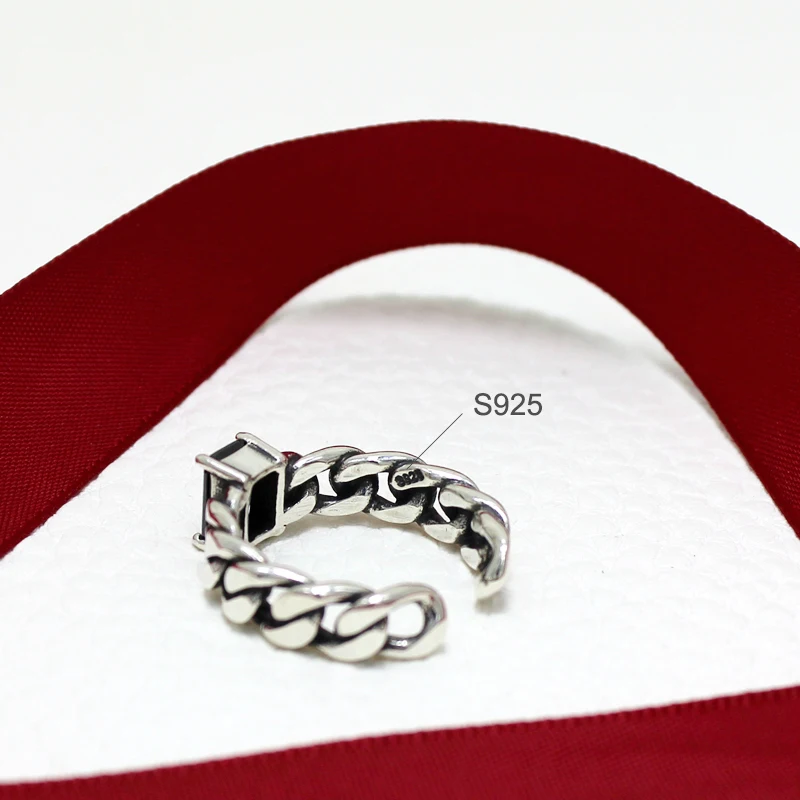 Real 925 Sterling Silver Vintage Black Square Agate Chain Open Ring For Women Adjustable Fine Jewelry Punk Luxury Rings