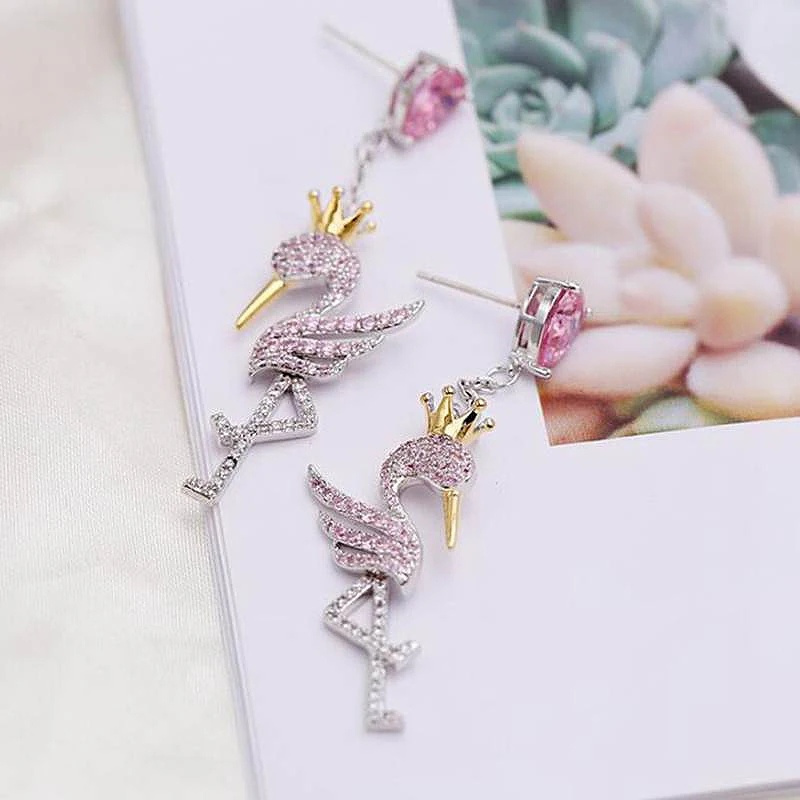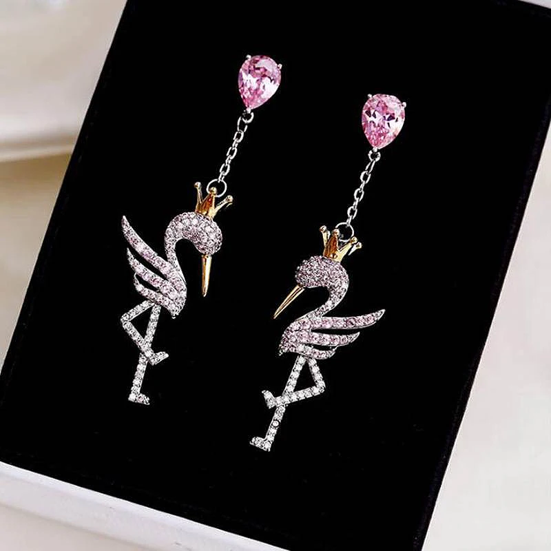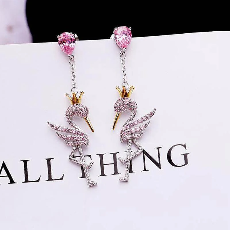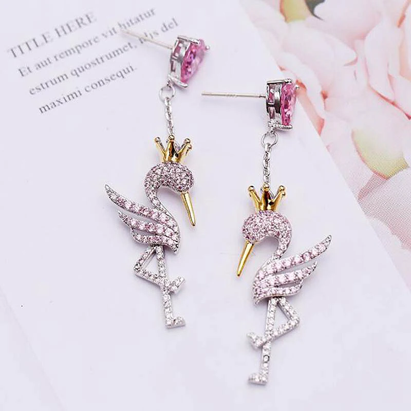 Pink CZ Crown Swan Ladies 925 Sterling Silver Pin Long Drop Piercing Earrings for Women Party Jewelry Best Gift YEA064