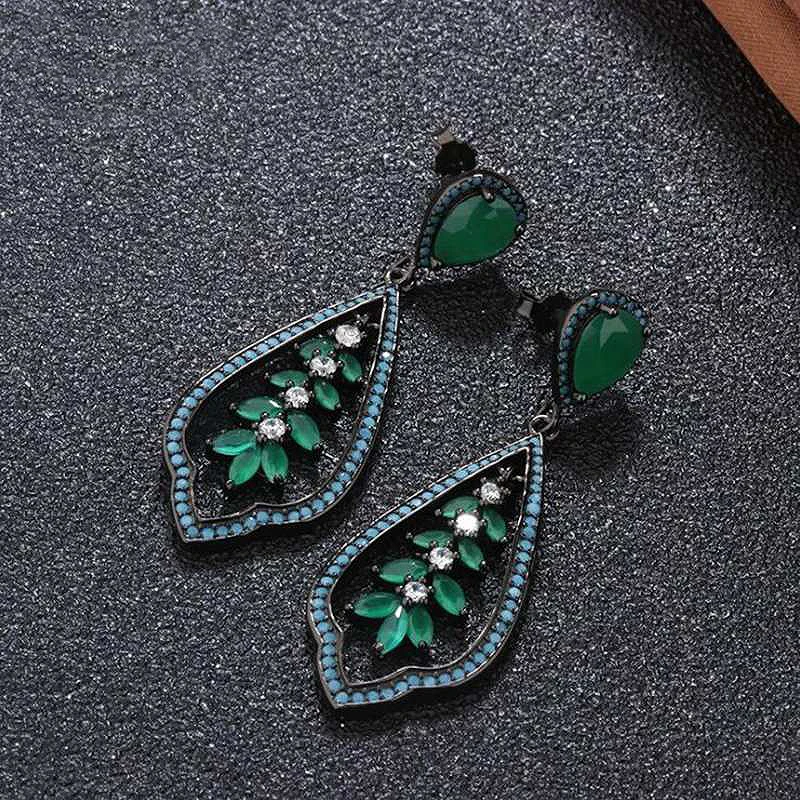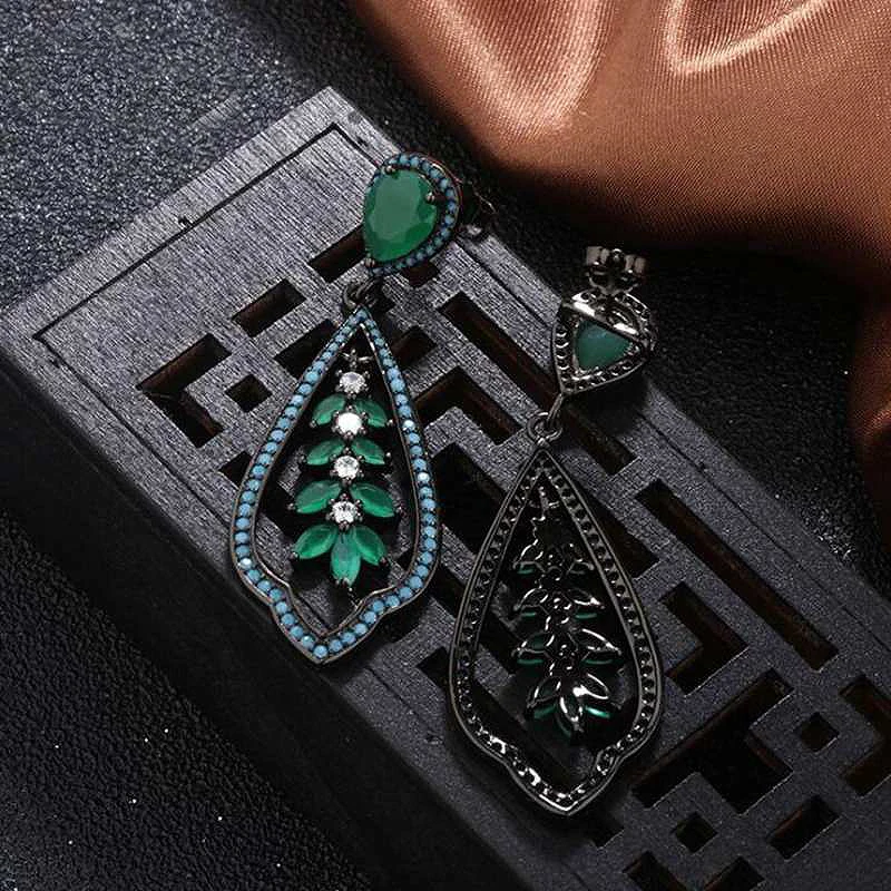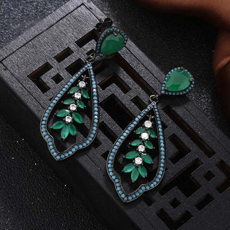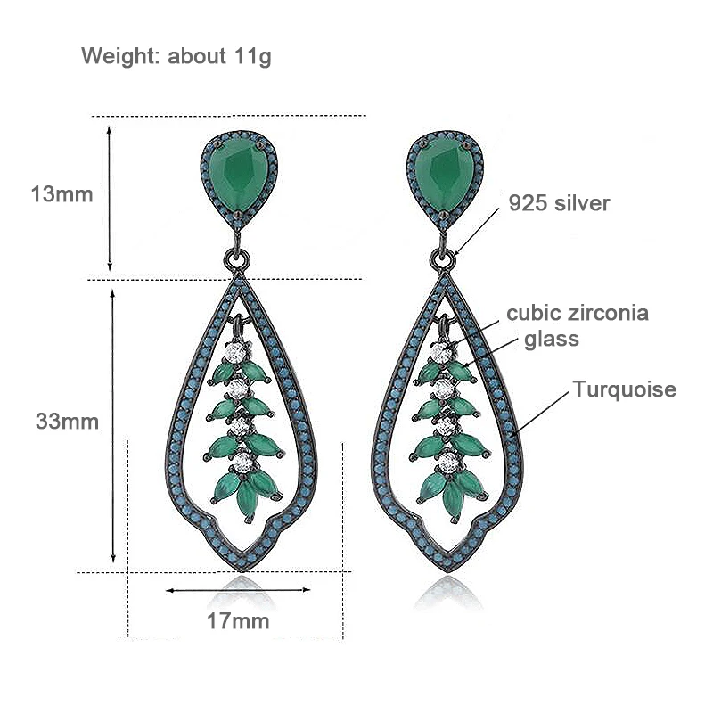 Plant Shape Turquoise Drop Earrings for Women Green Cubic Zircon and Glass Black 925 Silver Jewelry Party Earrings YEA157