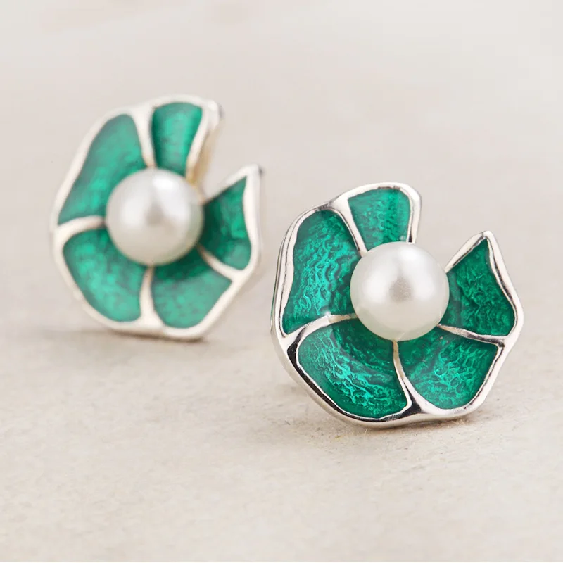S925 silver hand inlaid earrings antique pearl beads enamel stud, fashionable flower, female silver jewelry