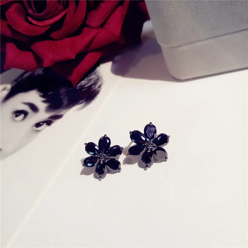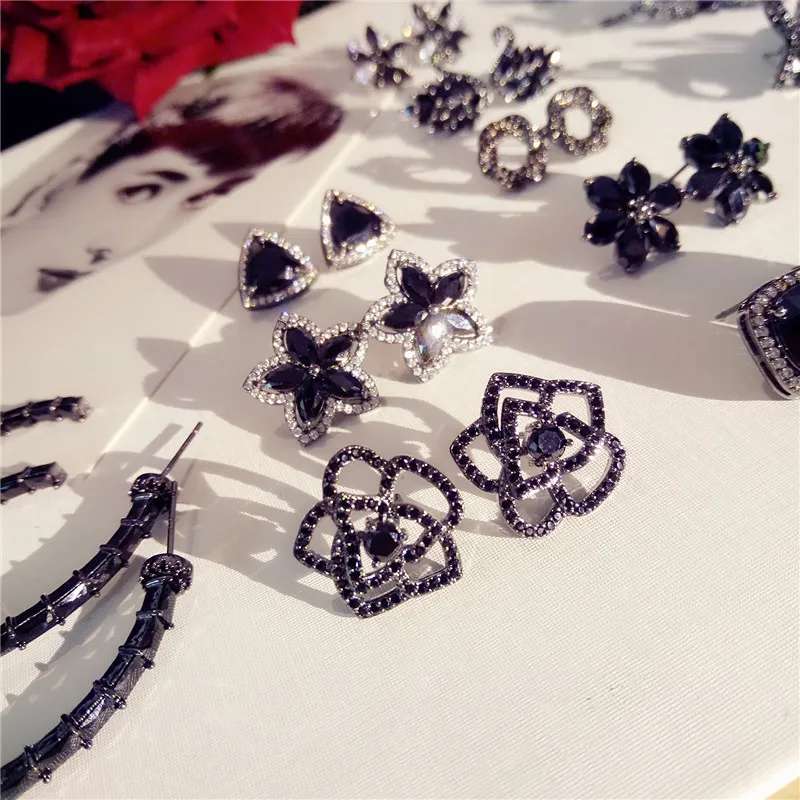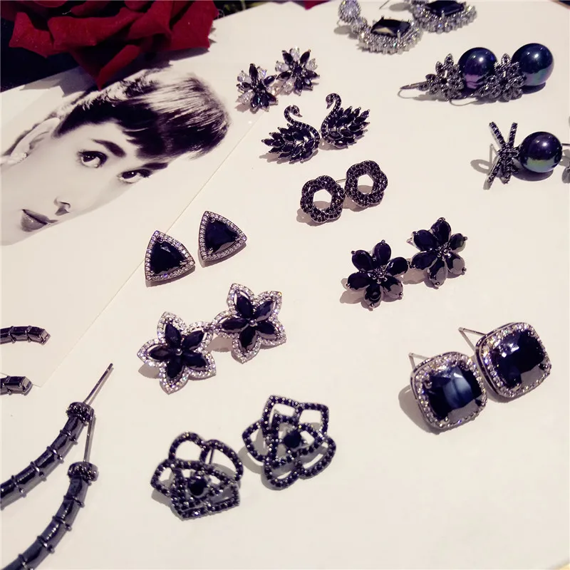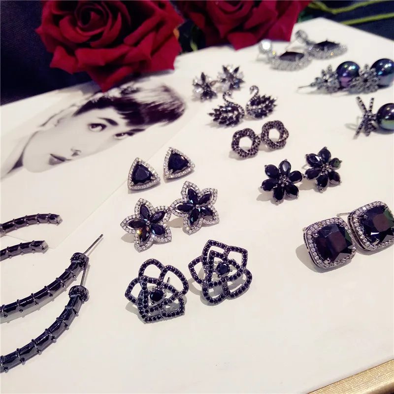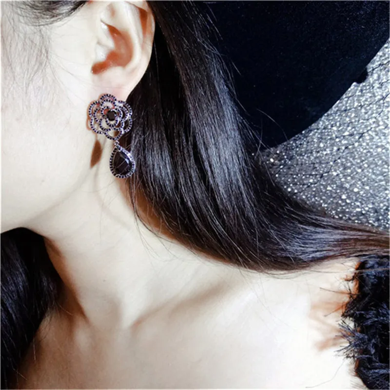 S925 Sterling Silver Fine Jewelry Drop Earrings For Women Black Spinel Simple Temperament Vintage Rose Swan Eardrop Brincos