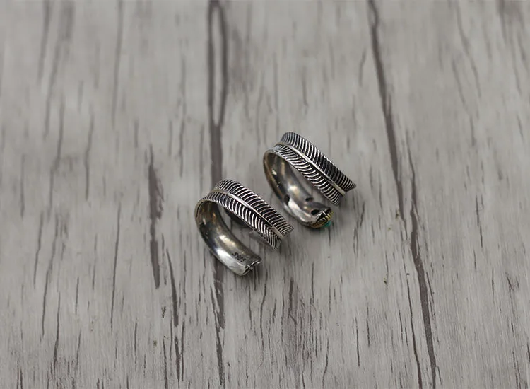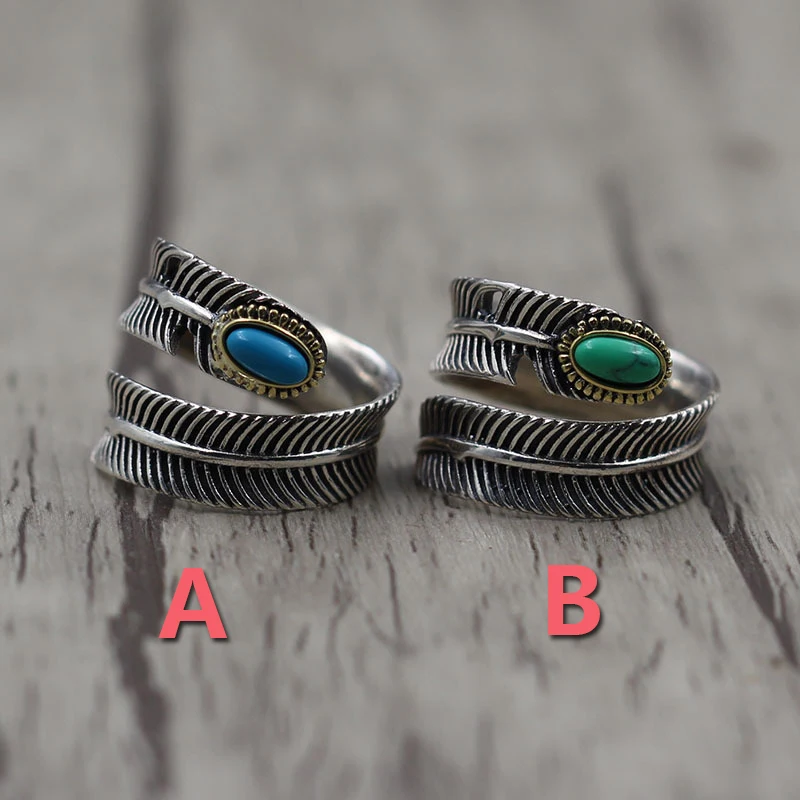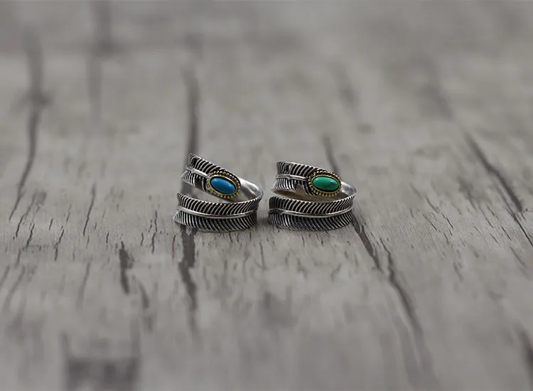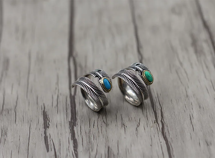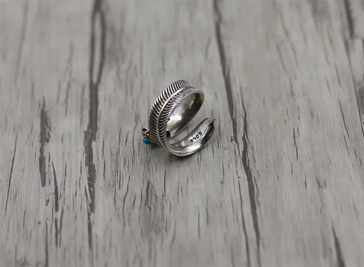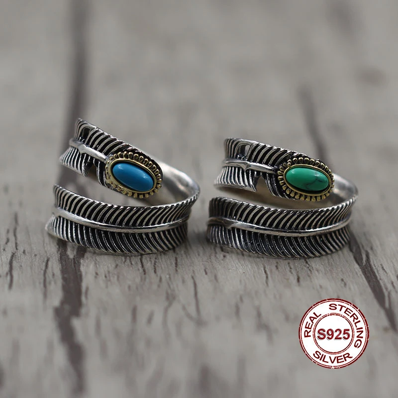 S925 Sterling Silver Ring in Popular classic style Feather series trendy jewelry Inlaid turquoise gift of love Indian style
