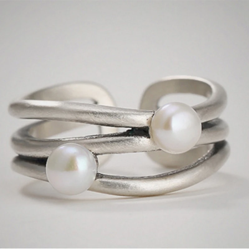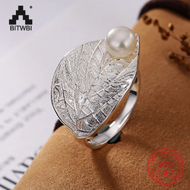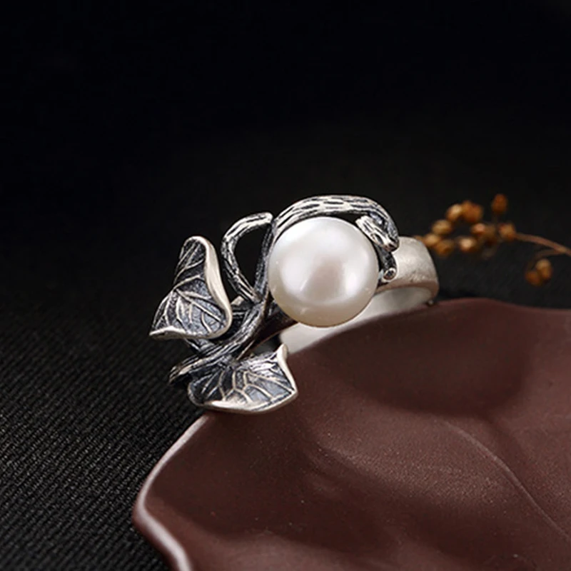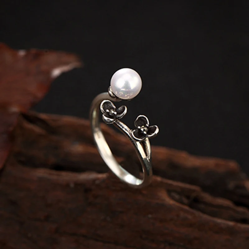 S925 Sterling Silver Thai Silver Nature White Jade Natural Pearl Ring Vintage Classical Plum Flower Leaf Women Open Rings