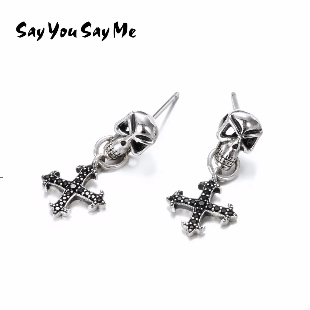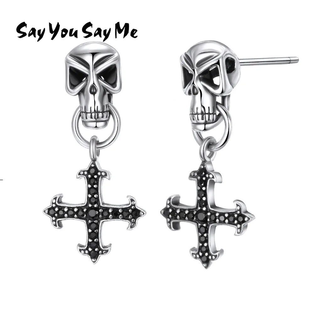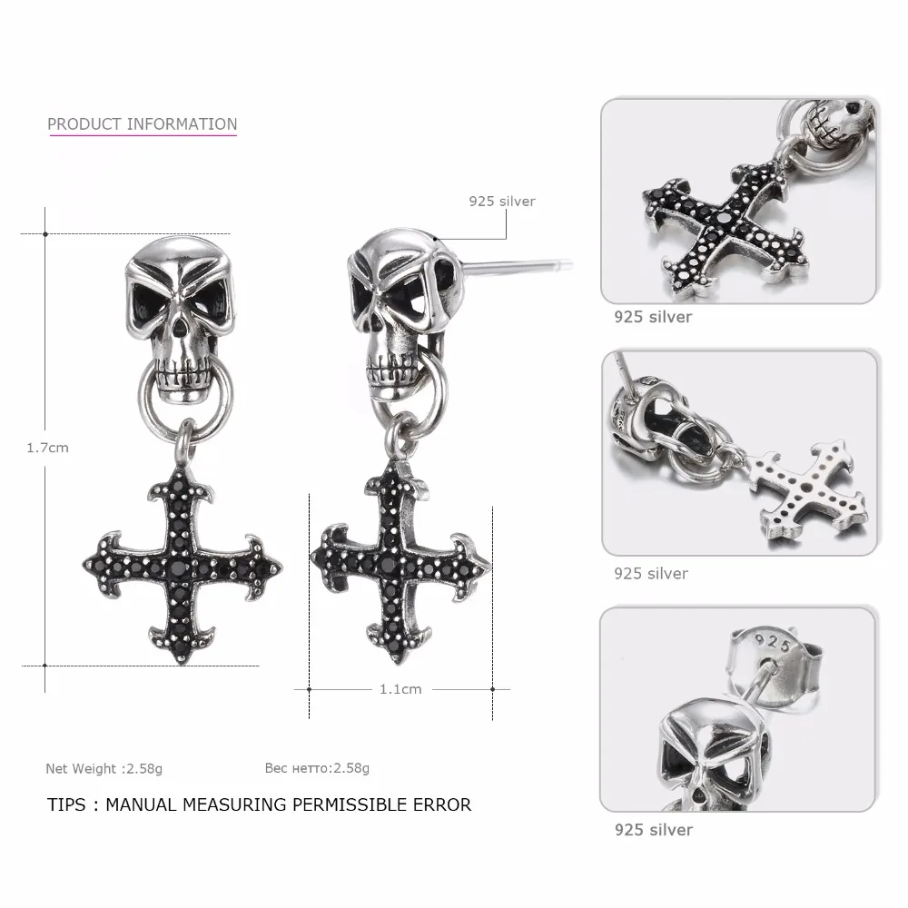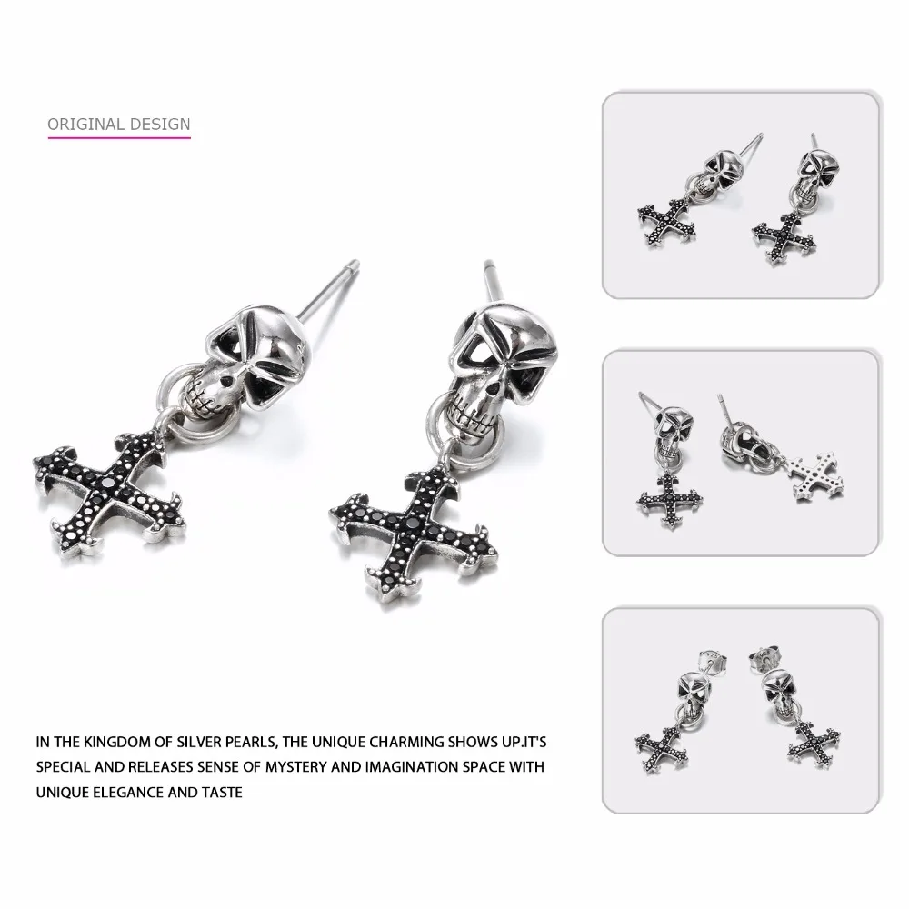 925 Sterling Skull Earrings Wholesale Fashion Black Zircon Cross Earrings Unisex Best Gifts 2020 New Arrival