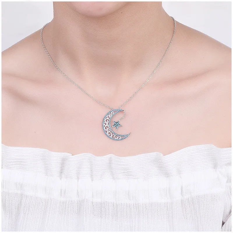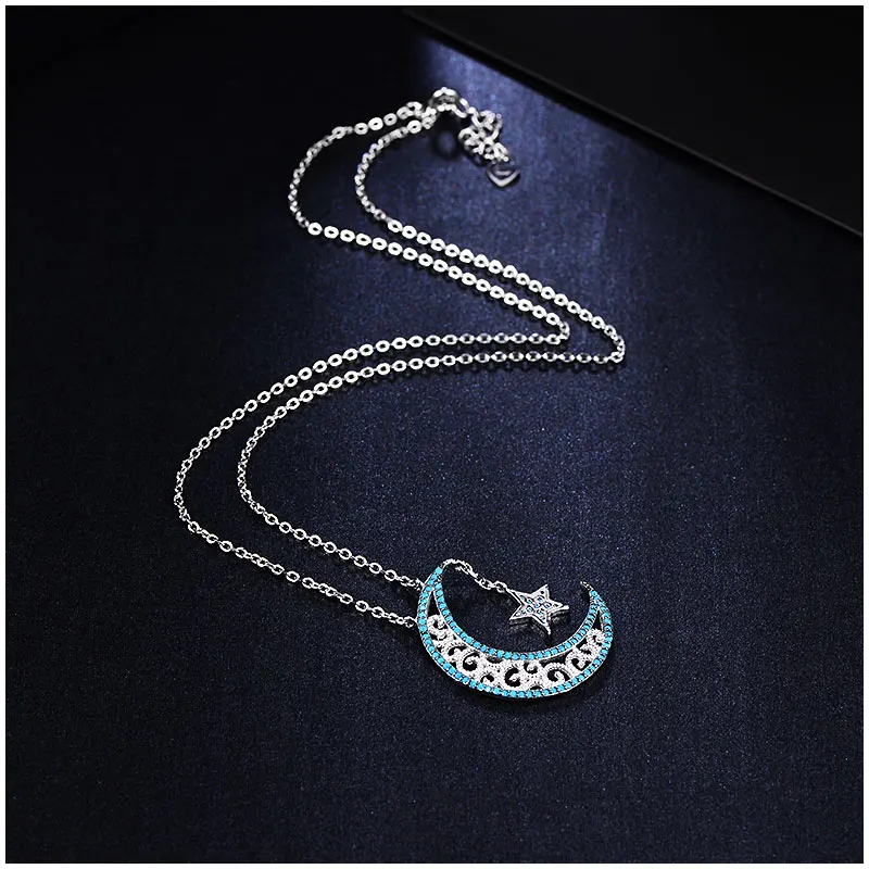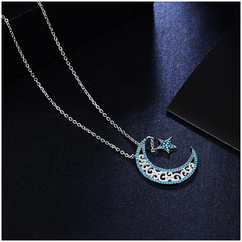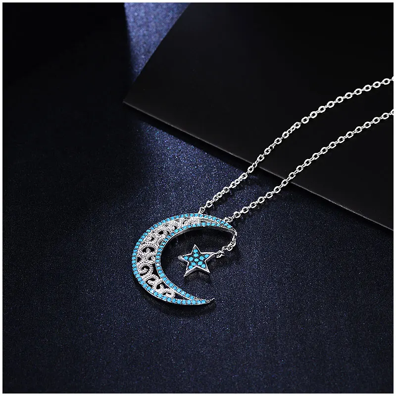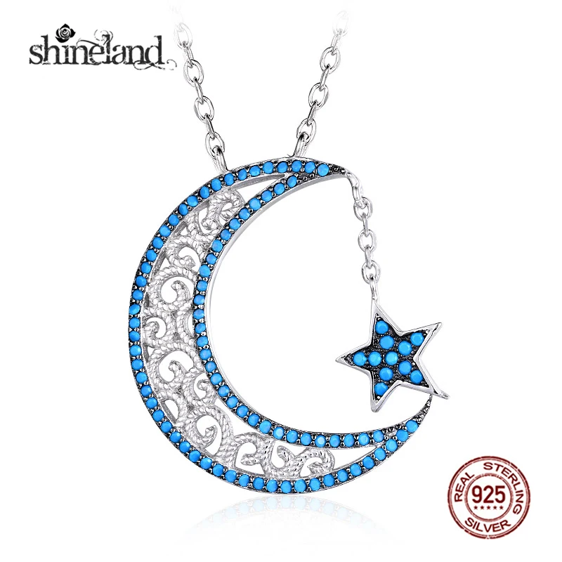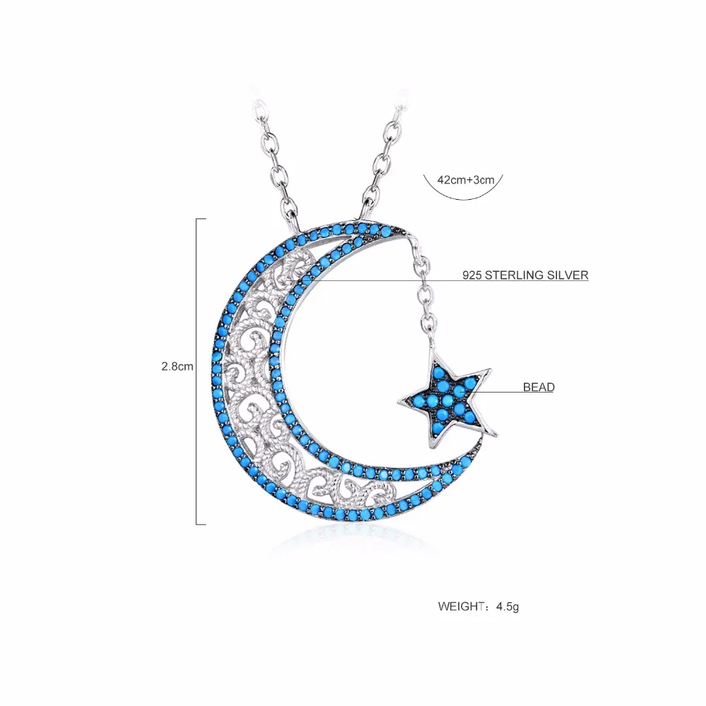 Vintage Blue Beads Moon Star Carved Hollow Pendant Necklace For Women Valentines Gift 925 Sterling Silver Fine Jewelry