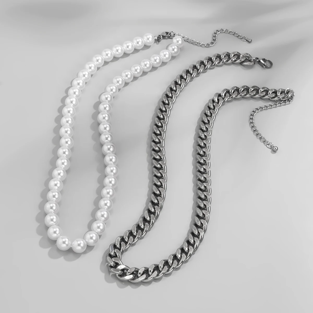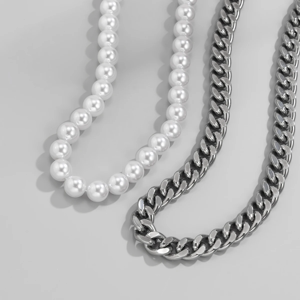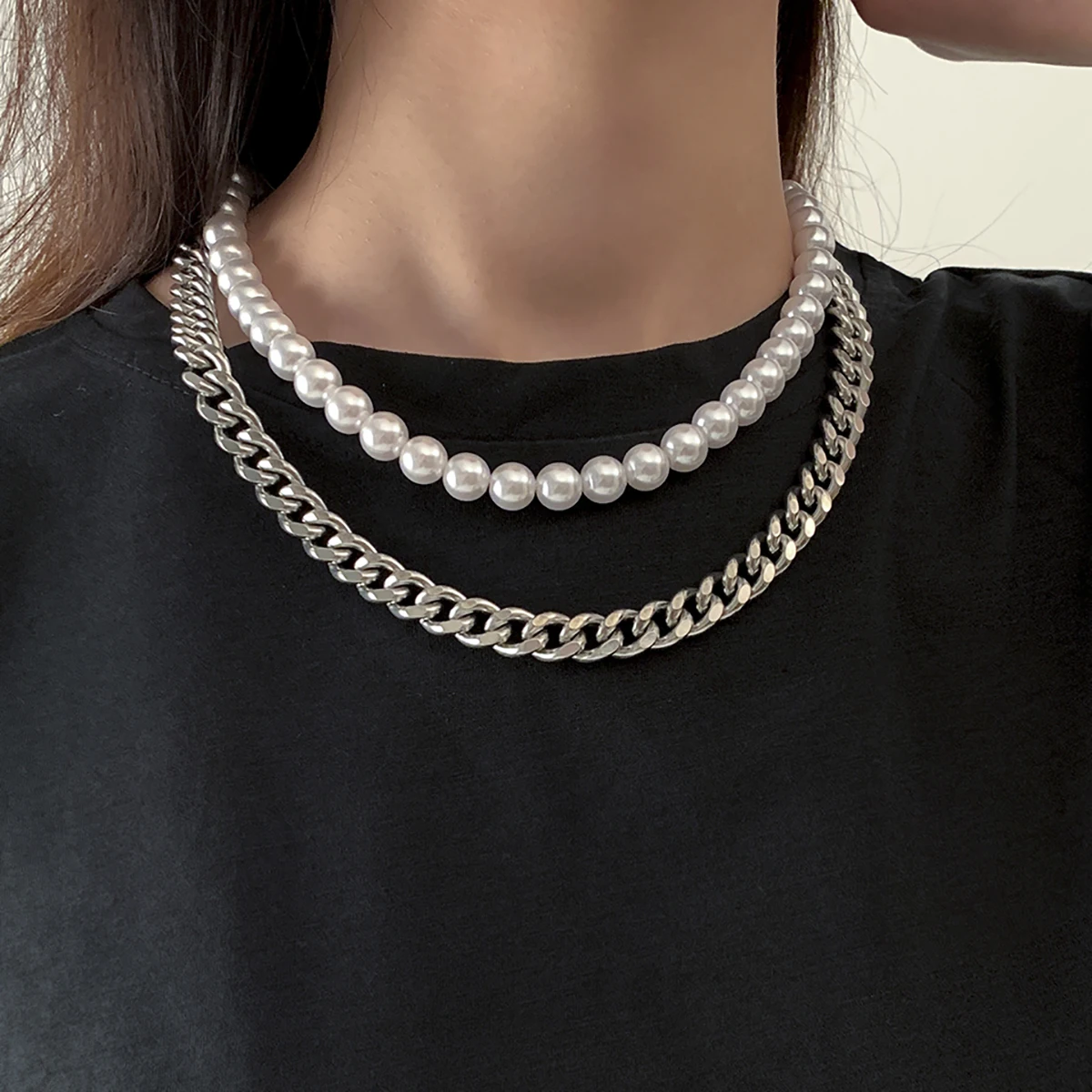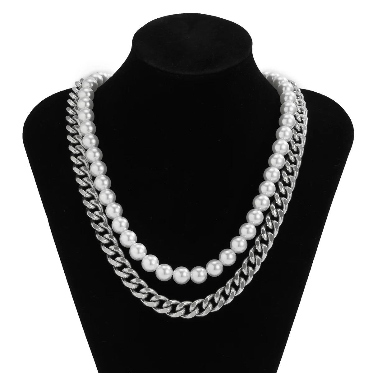 SHIXIN Punk Stainless Steel Layered Pearl Necklaces for Women Men Thick Necklaces Chains on the Neck Jewelry Collar 2021