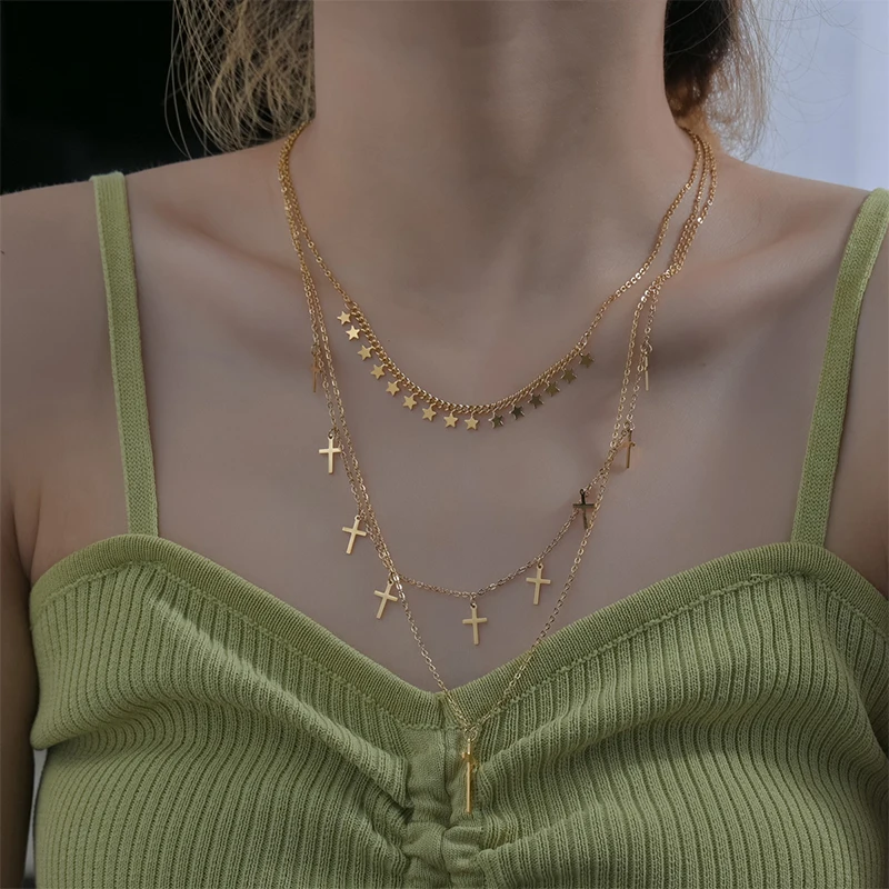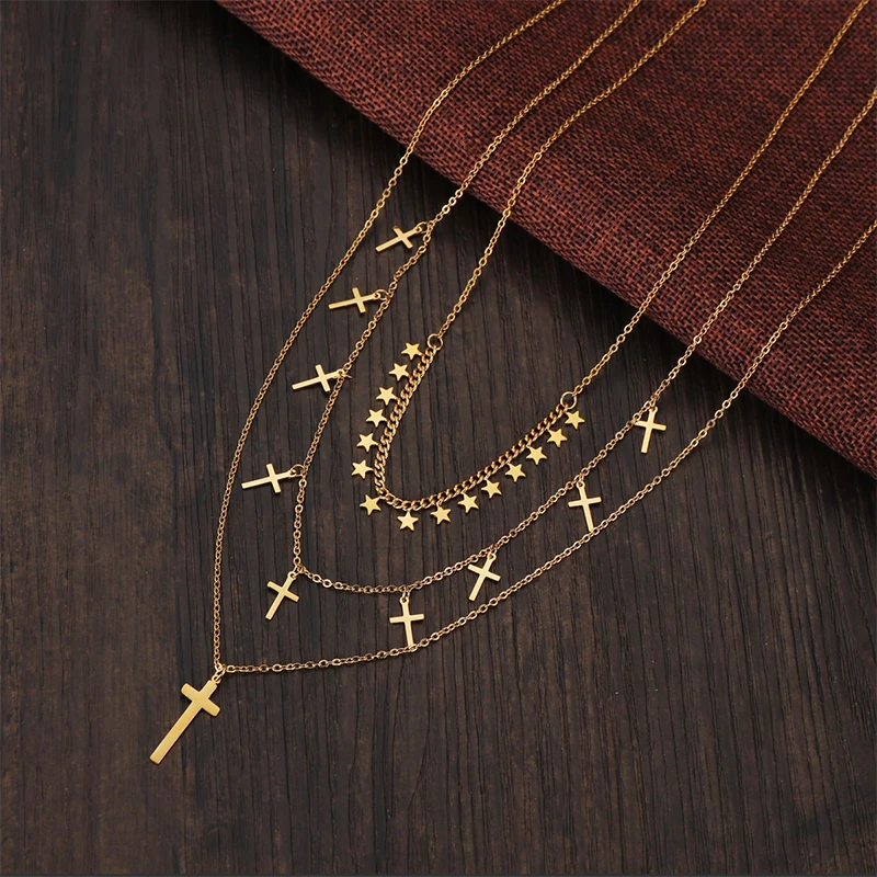 Sifisrri 2021 Vintage Stainless Steel 3 layers Stars Cross Choker Necklace for Women Girl Birthday Gift Jewelry Collar