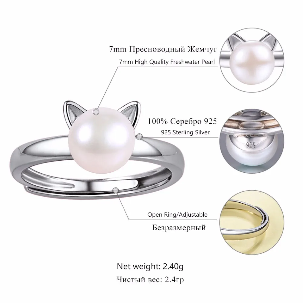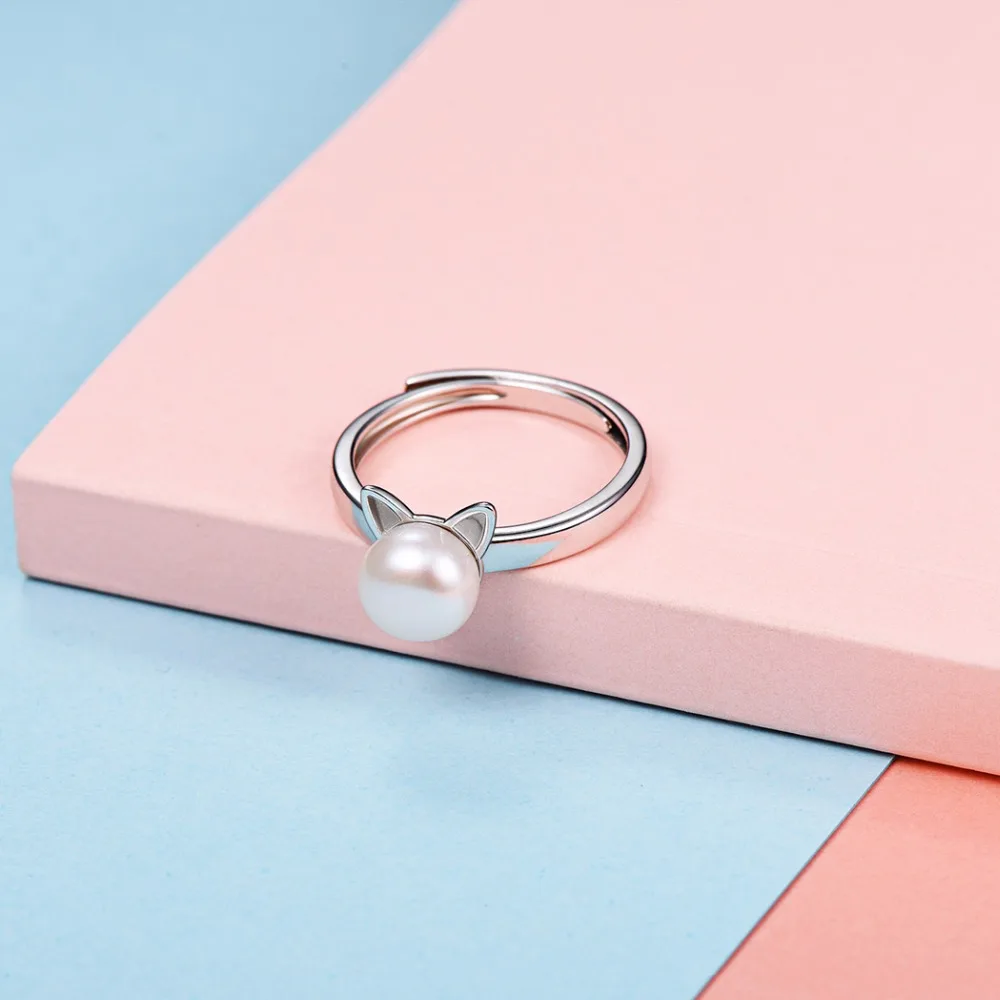 Pearl Rings For Women Girls Genuine 925 Sterling Silver Gold Color Cat Ear Open Ring Fine Jewelry SCR6008B