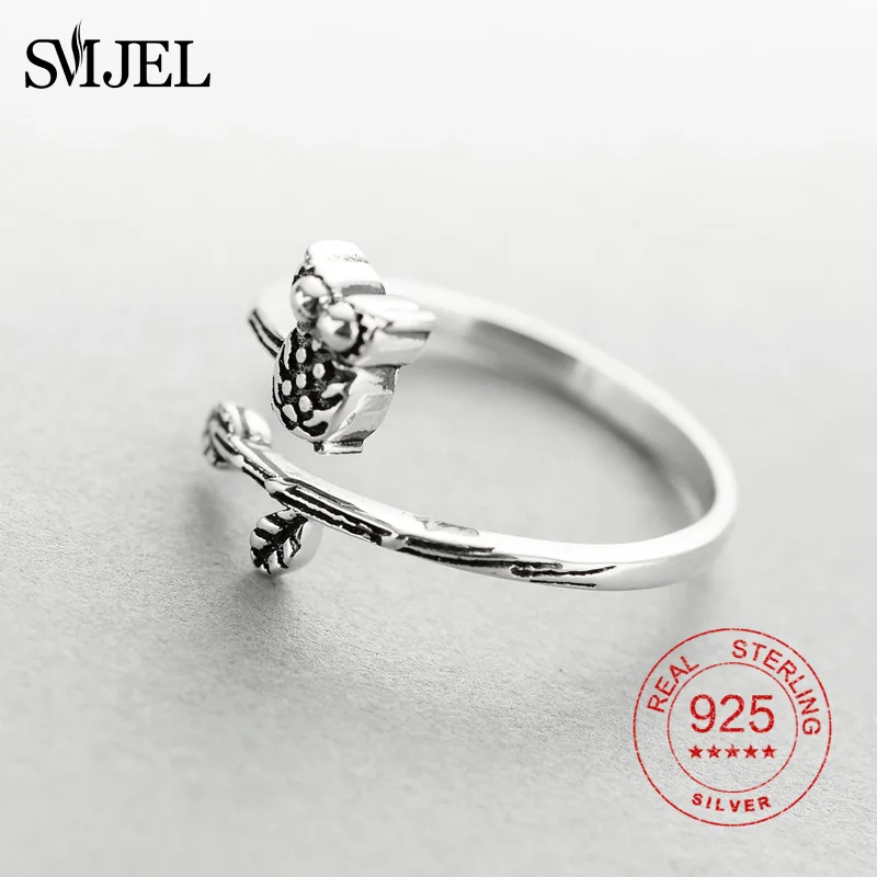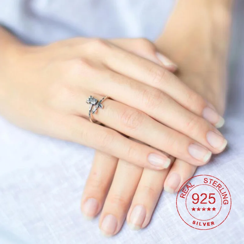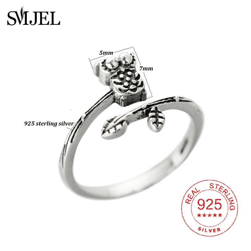 100% Sterling Silver Cute Night Owl Open Rings for Women Boho Leaf Branch Animal Bird Natural Ring Wedding Jewelry