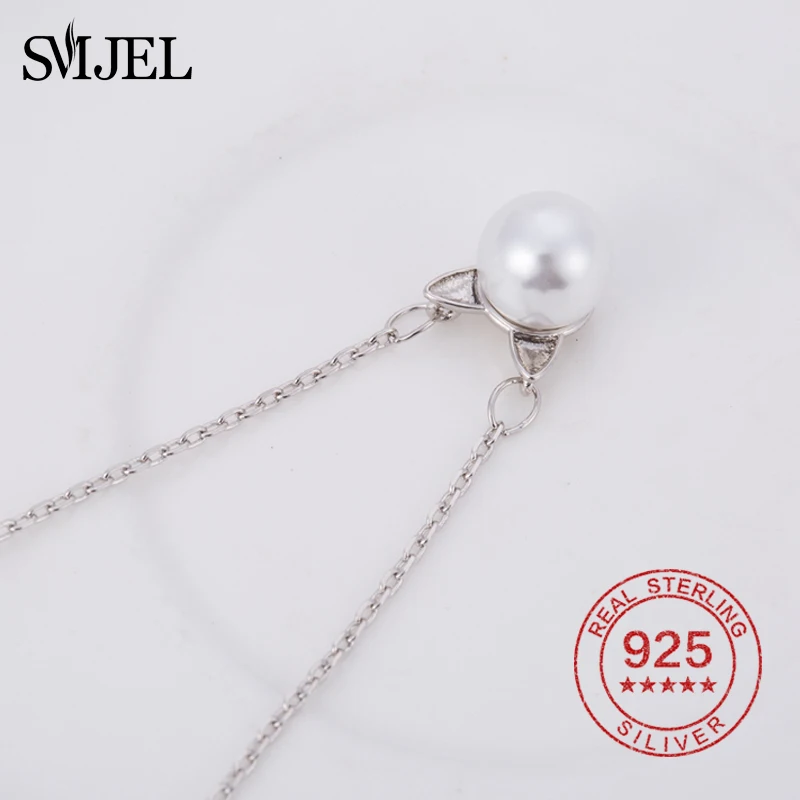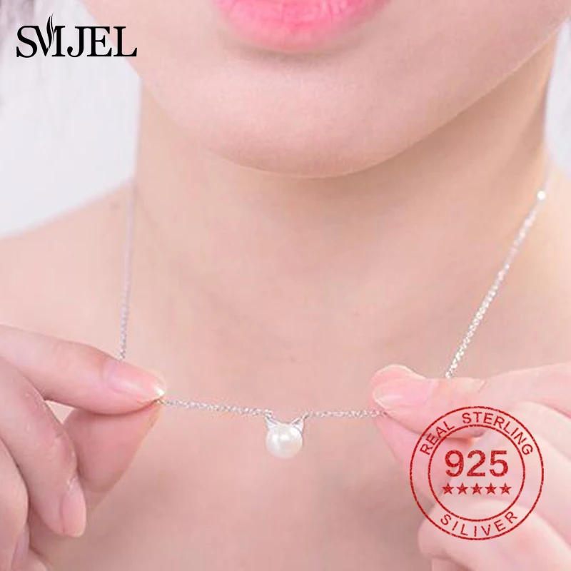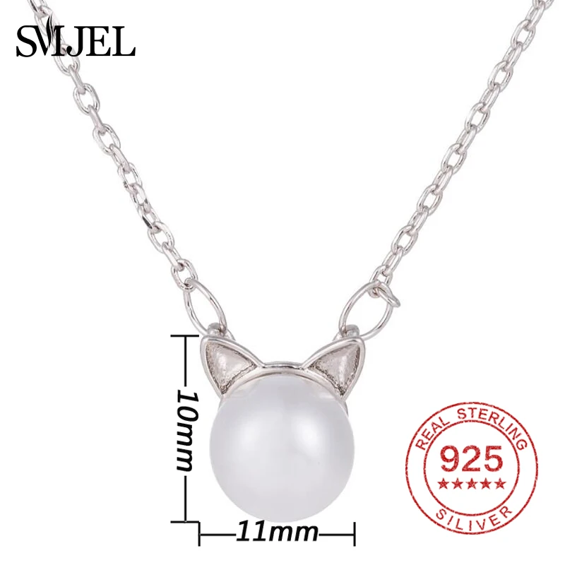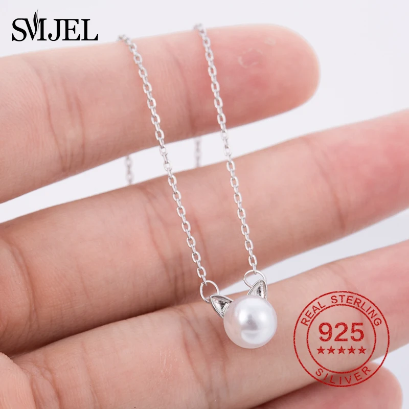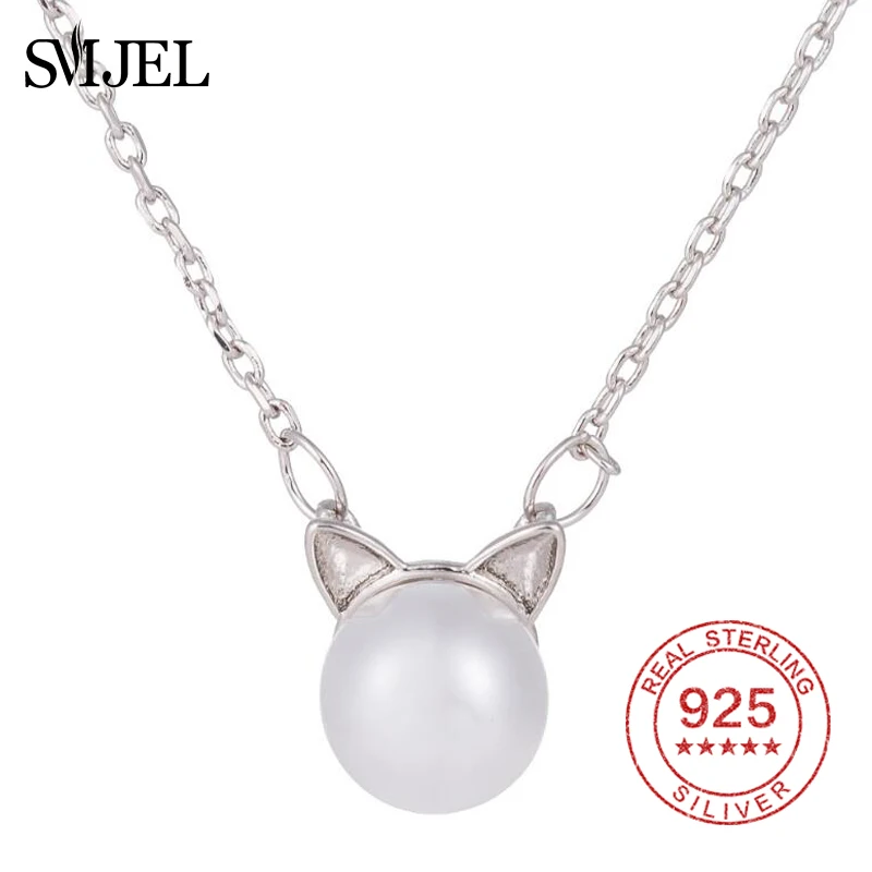 New Cute Cat Pearl Necklaces & Pendants for Women Animal Kitten Necklace 925 Sterling Silver Jewelry Collier Femme Bijoux