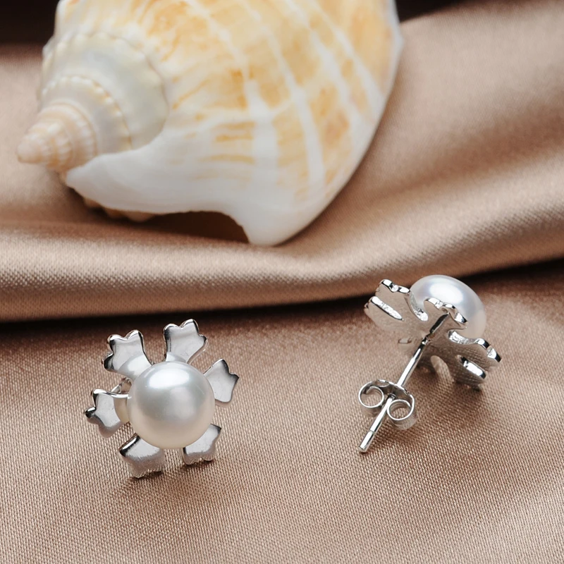 Snowflake 925 Sterling Silver Earrings for Women Party Jewelry Gifts 6-7MM White Natural Pearl Stud Earring FEIGE