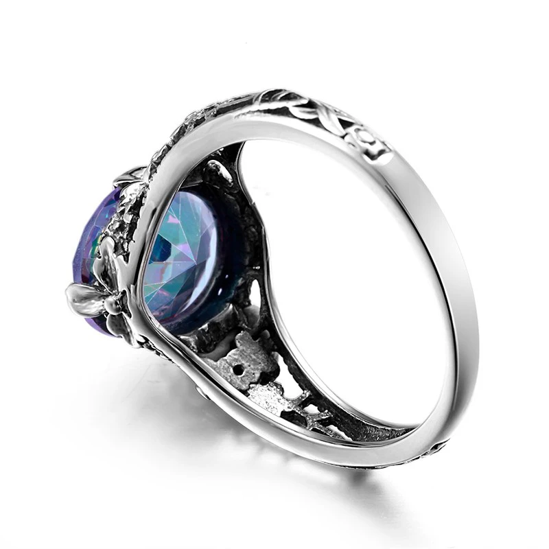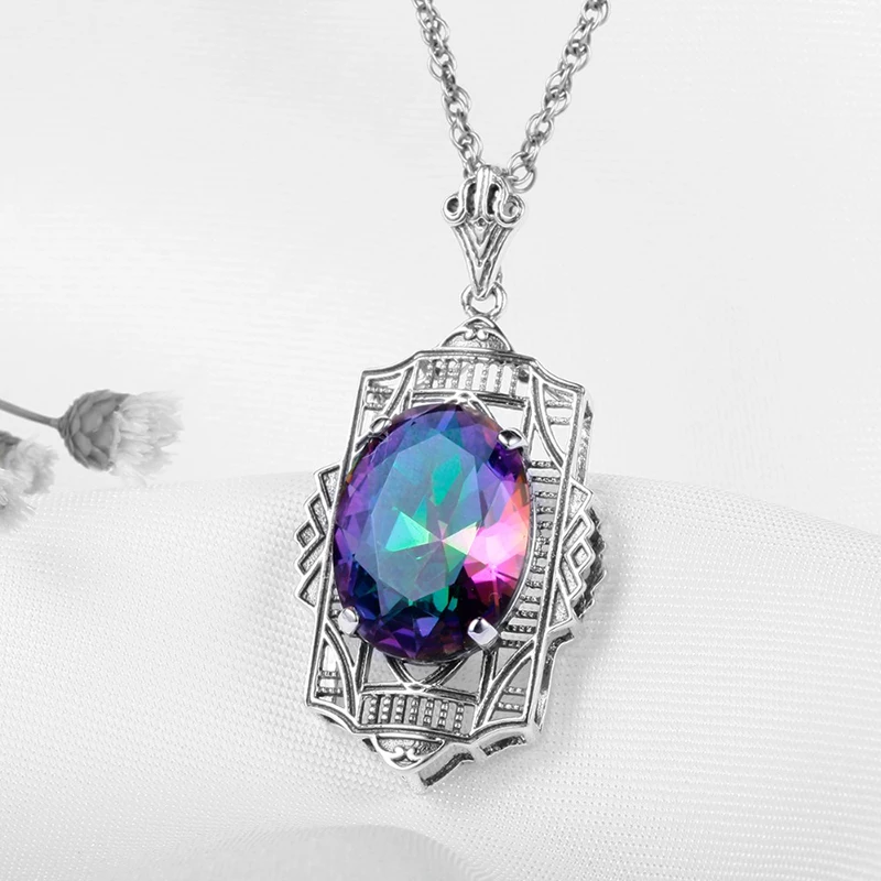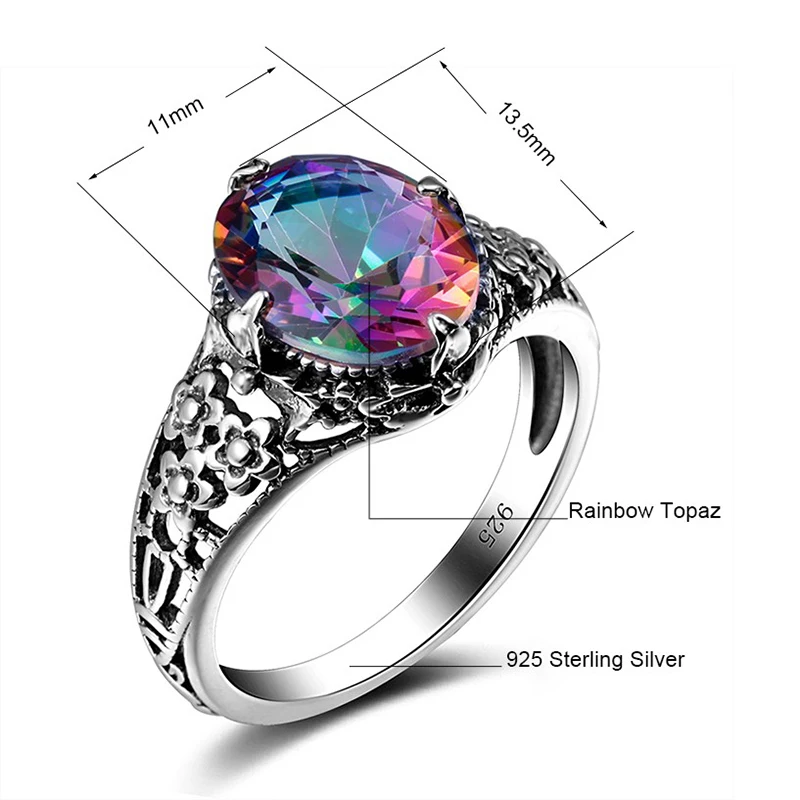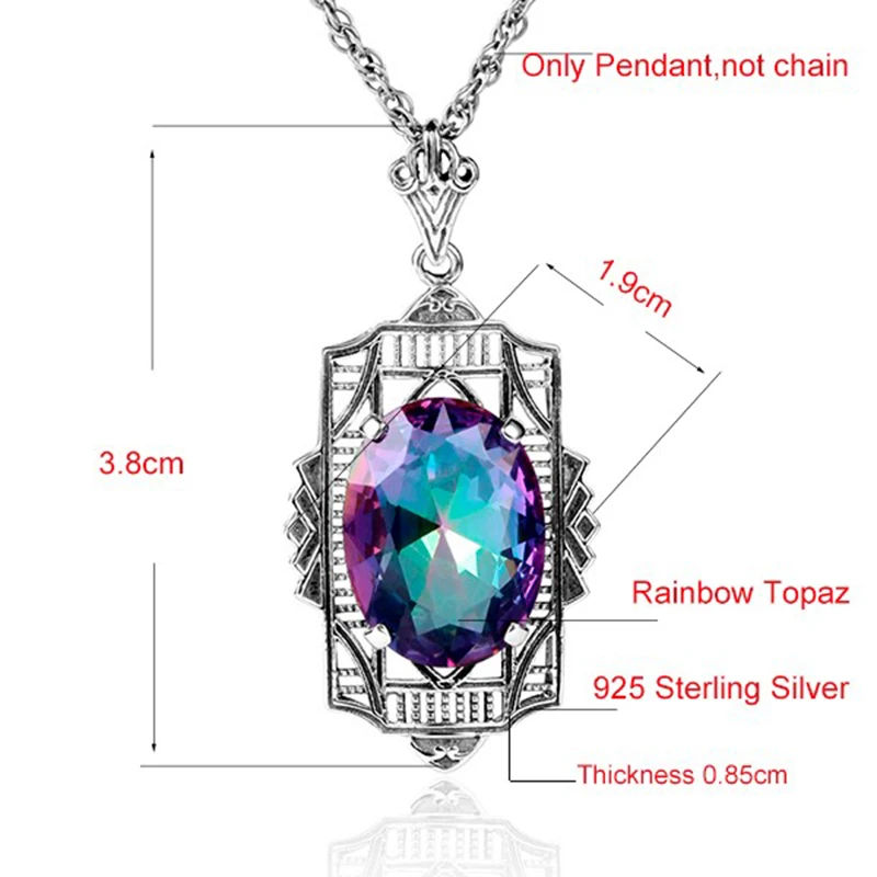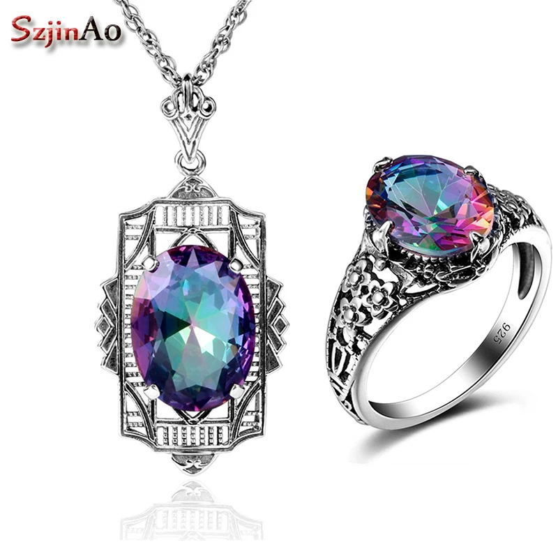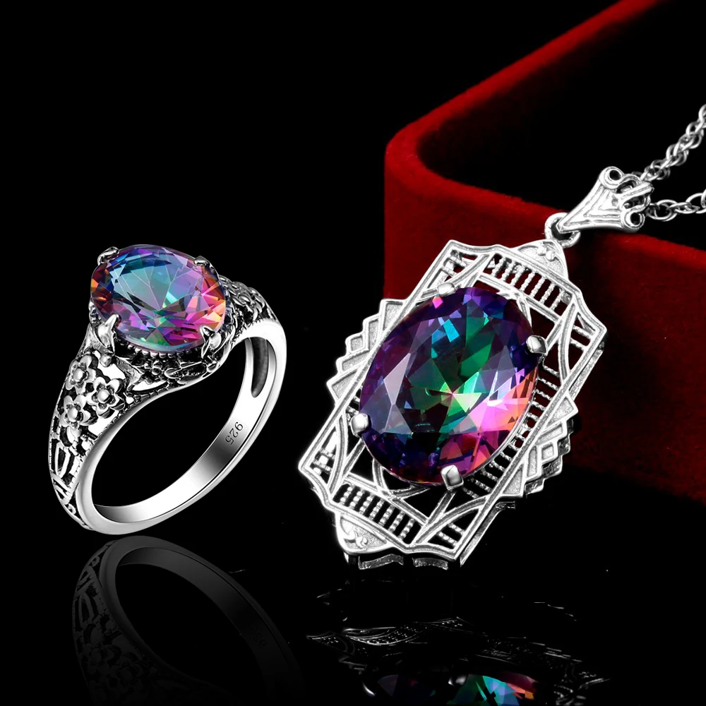 Solid 925 Sterling Silver Set Mystic Rainbow Topaz Ring+Pendant Vintage Wedding Bridal Bridesmaid African Jewelry Sets
