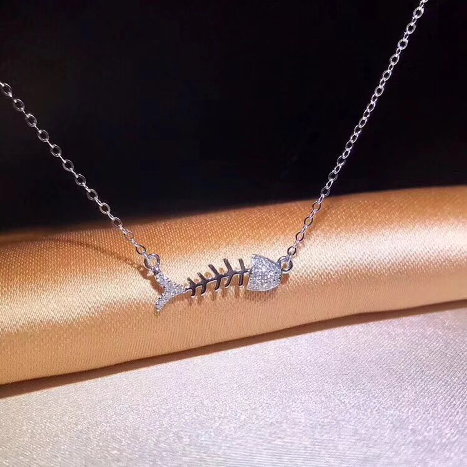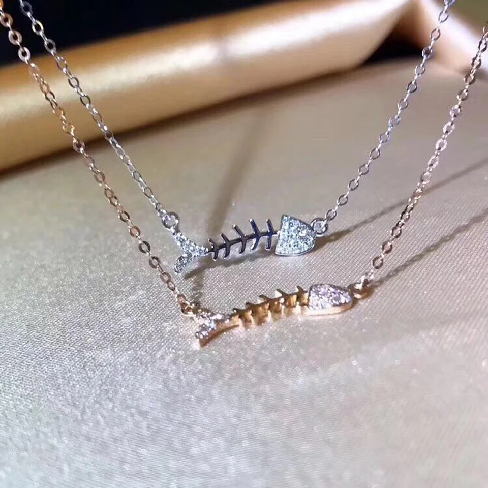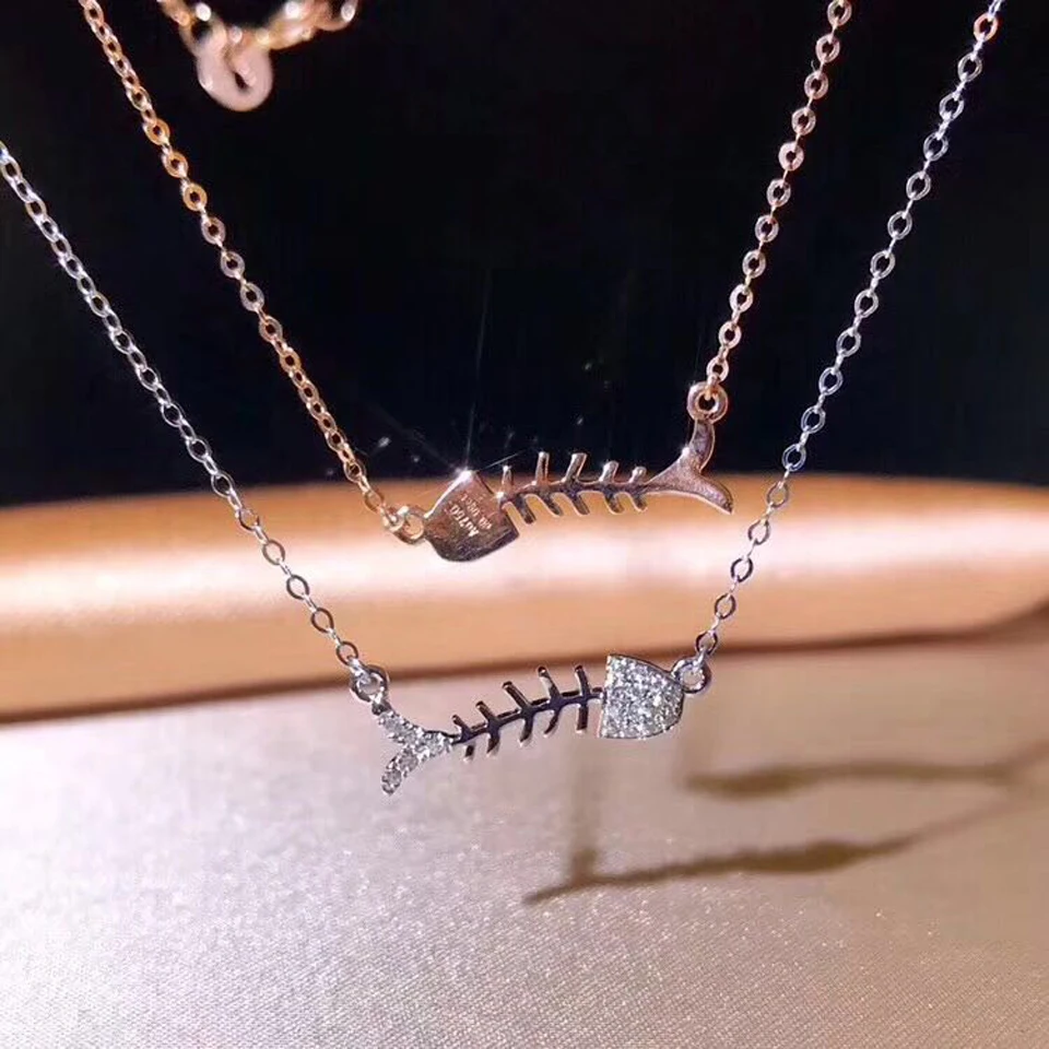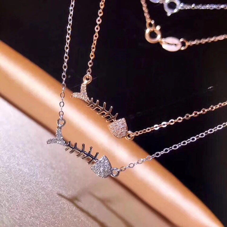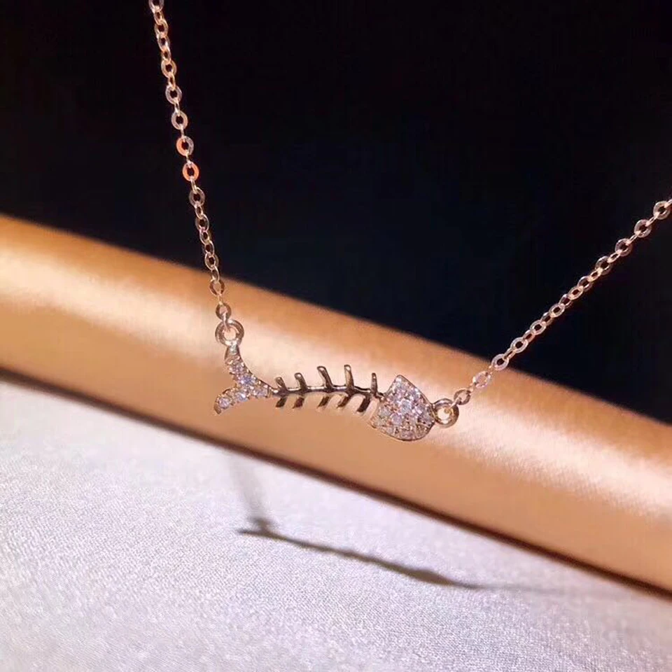Cute Fish Bone Pendant Necklaces For Women Real 18K Au750 Rose Gold 0.08CT VS G Natural Diamond Fine Jewelry Party Gift