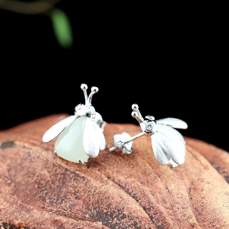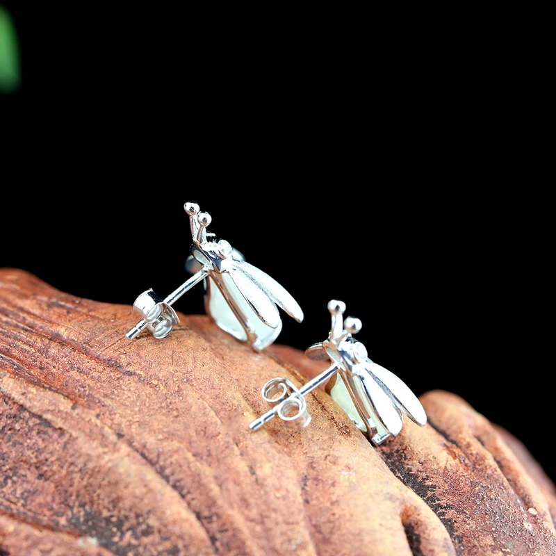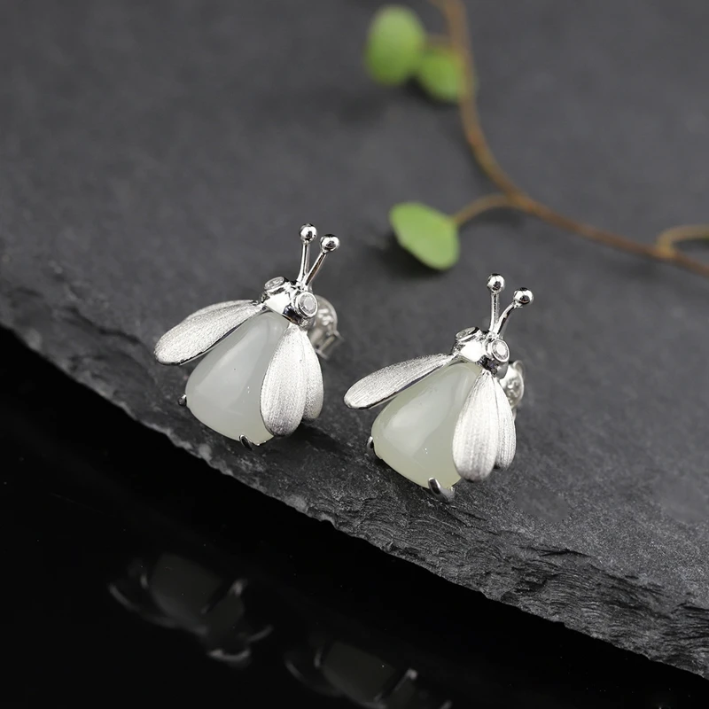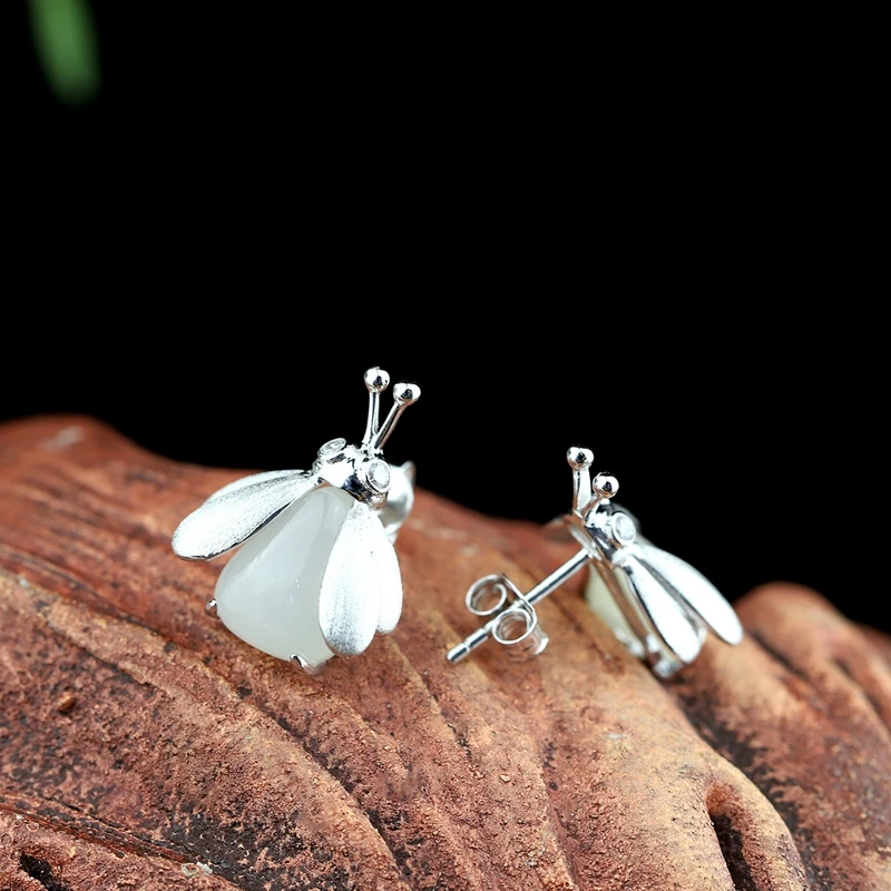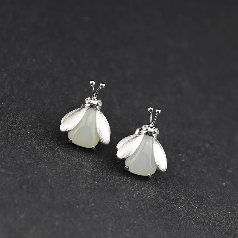 Sterling 925 silver insect jade earrings silver handmade fly insect natural white jade stud earrings for women jewelry charms