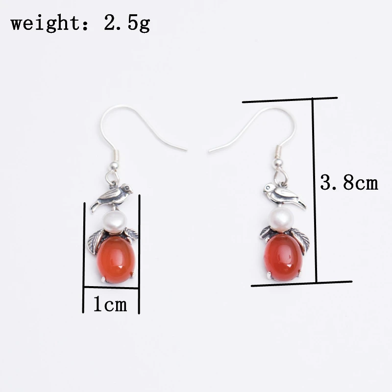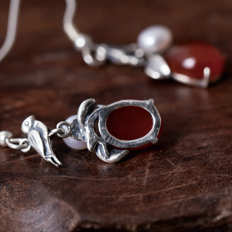 Sterling 925 silver pearl agate drop earrings handmade DIY natural red agate vintage birds earrings for women handmade jewelry