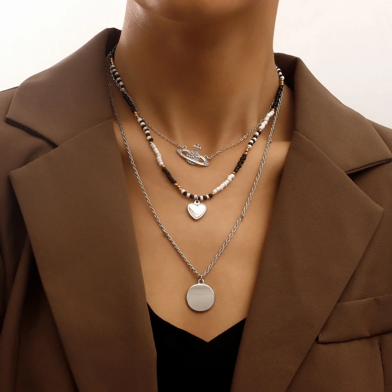 String Beads Necklaces for Women Boho Black White Bead Charm Chain Simple Heart Circular Pendant Necklace Female Jewlery