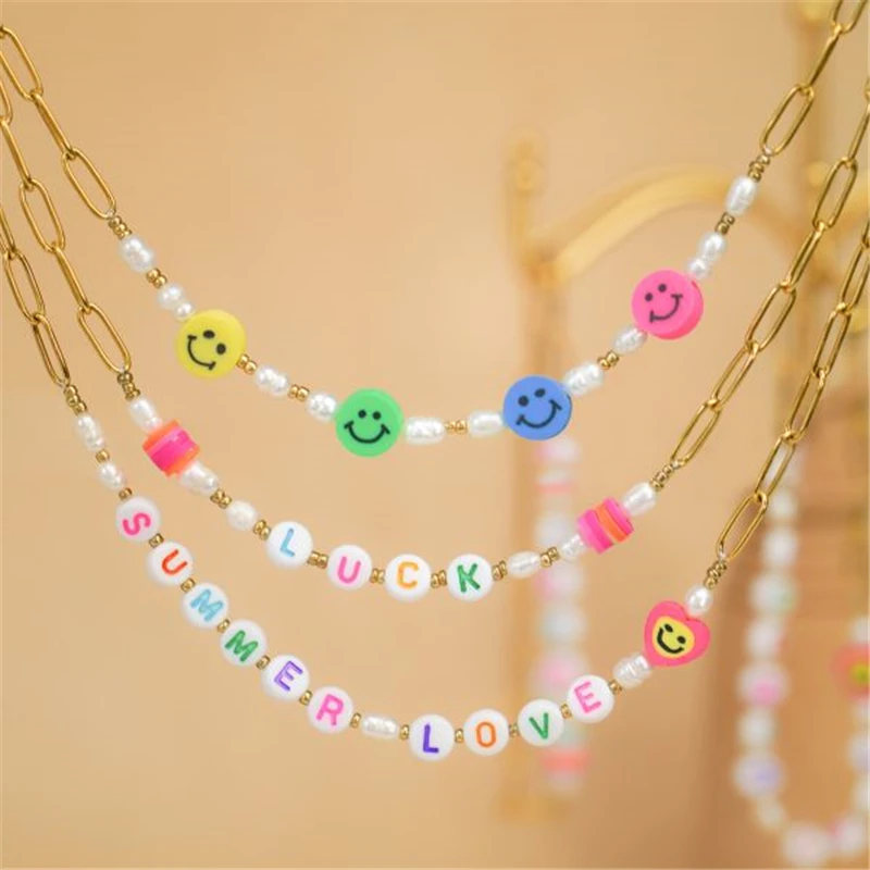 Summer Beach Pearl Handmade Chain Necklace For Lovers' Couples Valentine's Day Gift Colorful Letter Choker Necklaces Jewerly