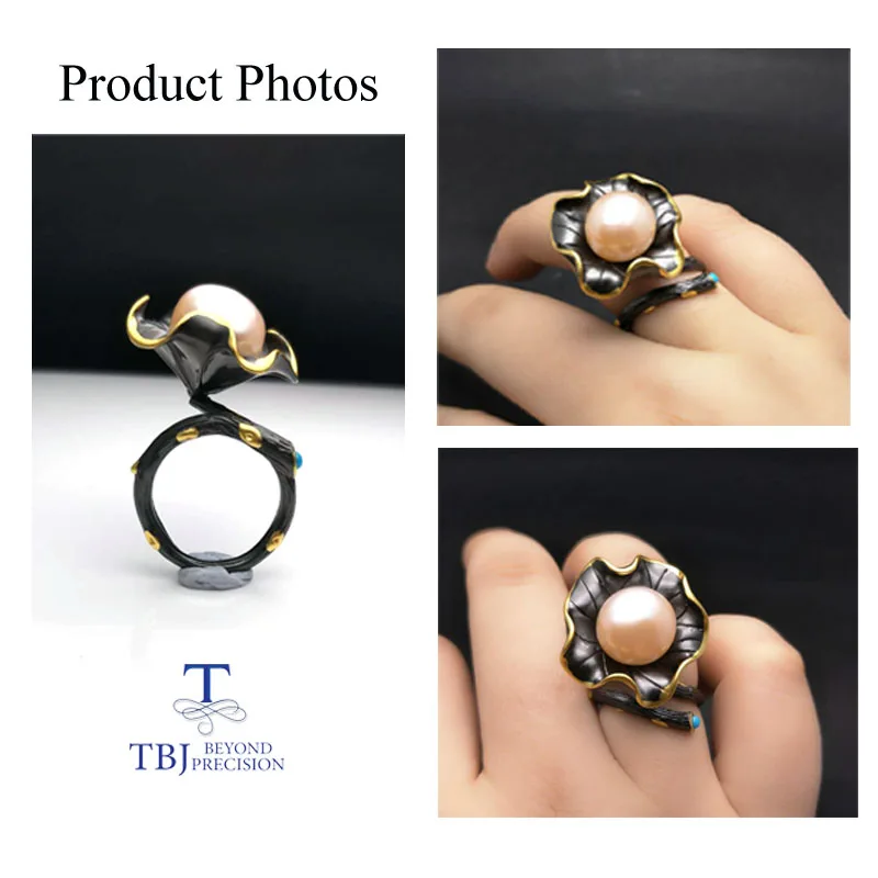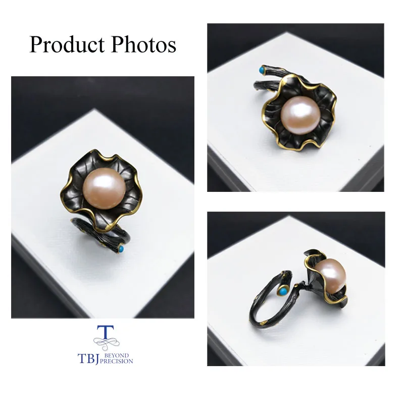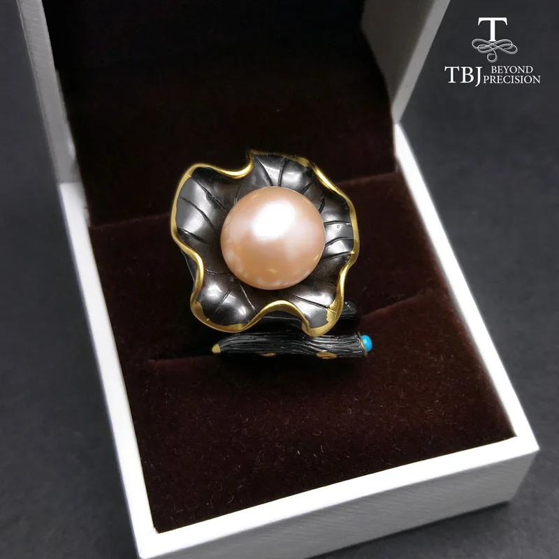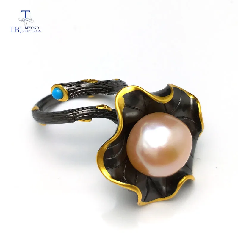 TBJ,Stylish Baroque natural pearl Ring and turquoise in 925 silver black & yellow gold color lotus leaf design for lady