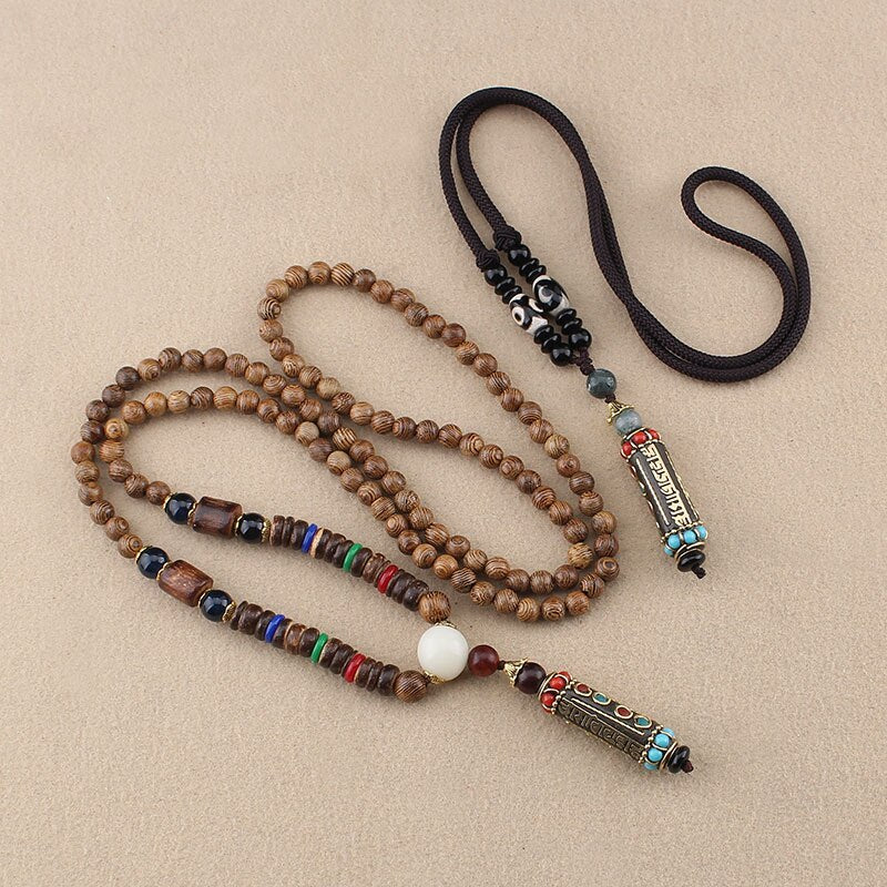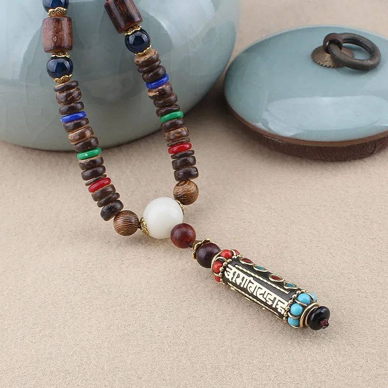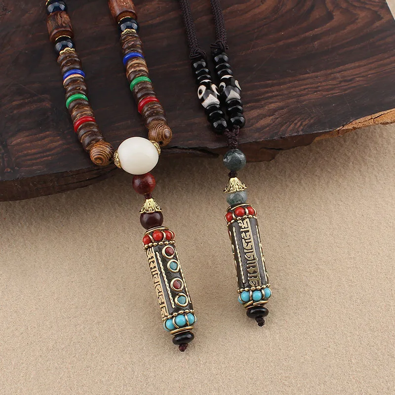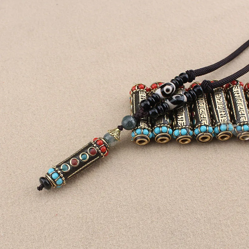 Tibetan Buddhist Handmade Simple Rope Chain Mantra Sign Six Words Pendant Necklace Buddhism Three Eyes Dzi Beads Amulet Necklace
