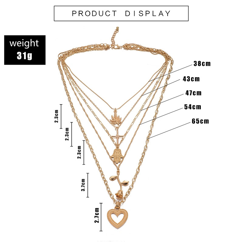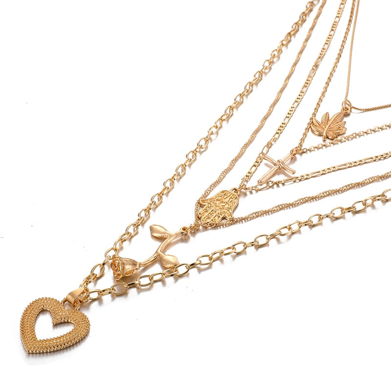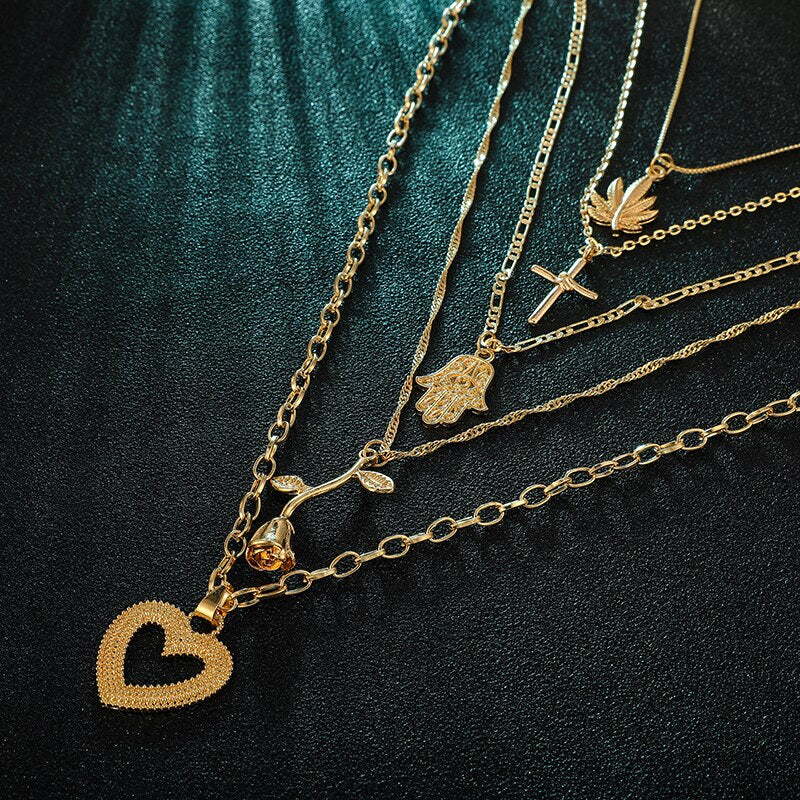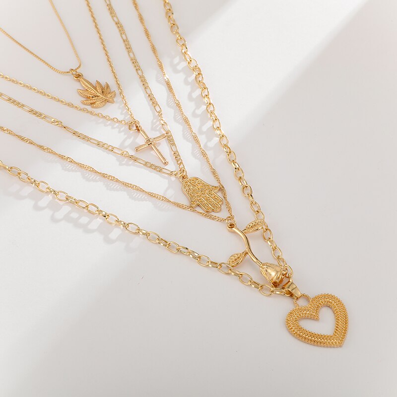 Tocona Bohemia Gold Rose Pendant Necklace for Women Multi-layer Heart Cross Leaf Hand Chain Choker Jewelry Collares D06402