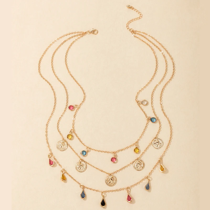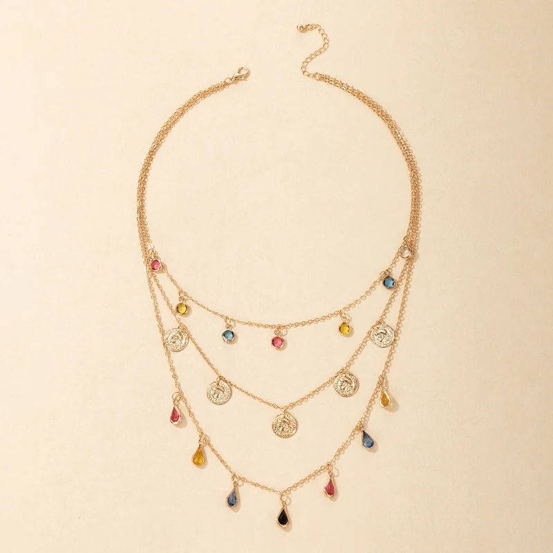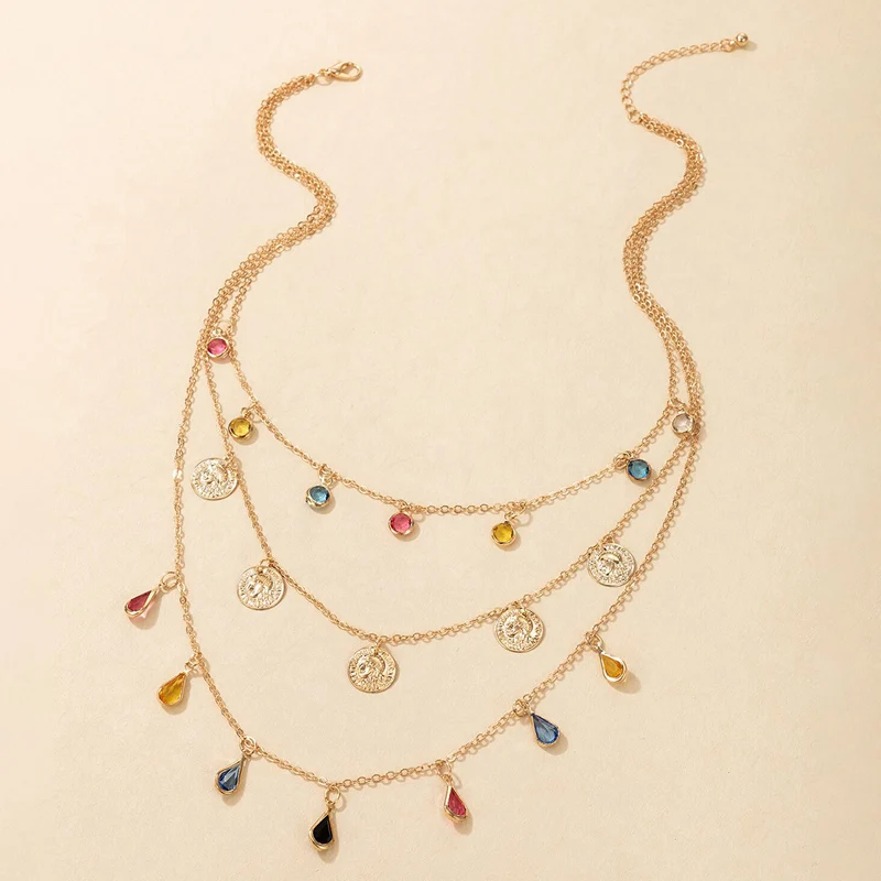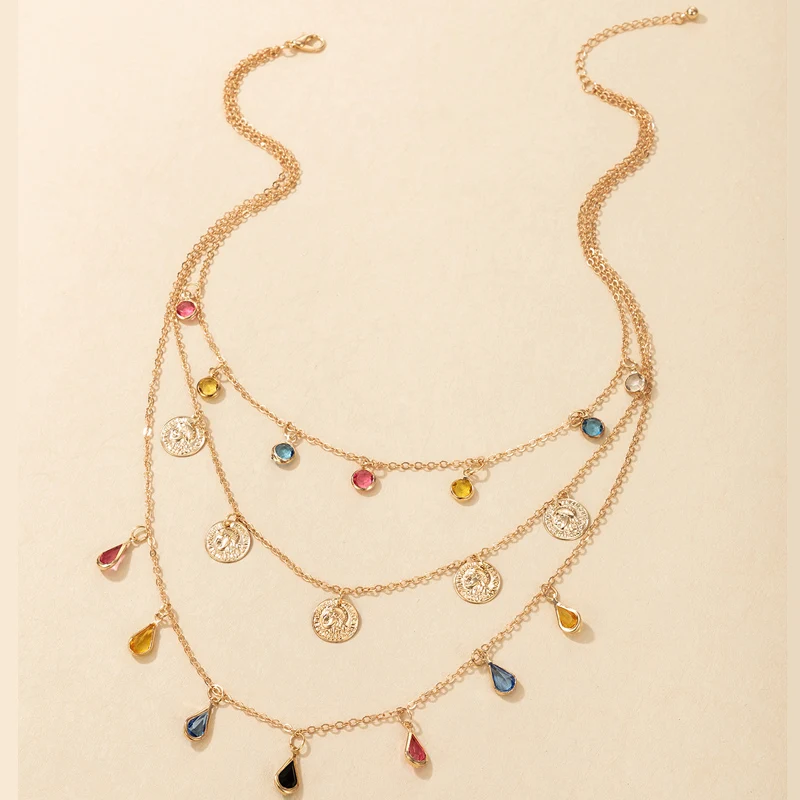 Tocona Colorful Crystal Stone Taasel Pendant Necklace for Women Charms Multi-layer Gold Alloy Metal Adjustable Jewelry 9950