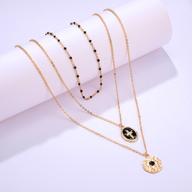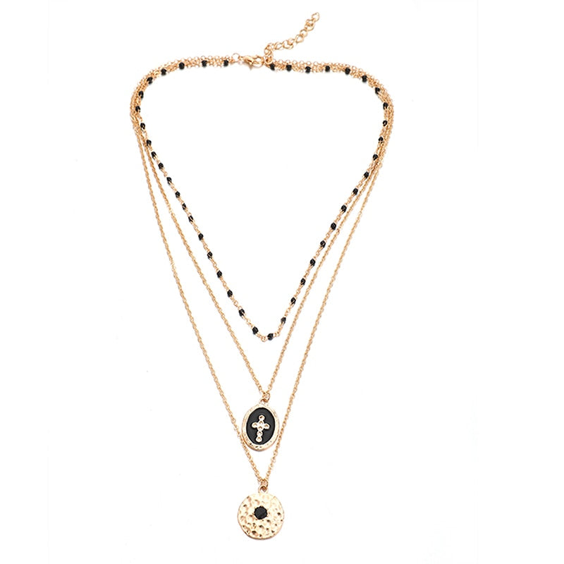 Tocona Multi-layer Retro Cross Pendant Necklace for Women Black Beaded Gold Chain Choker Geometric Bohemian Jewelry B25105