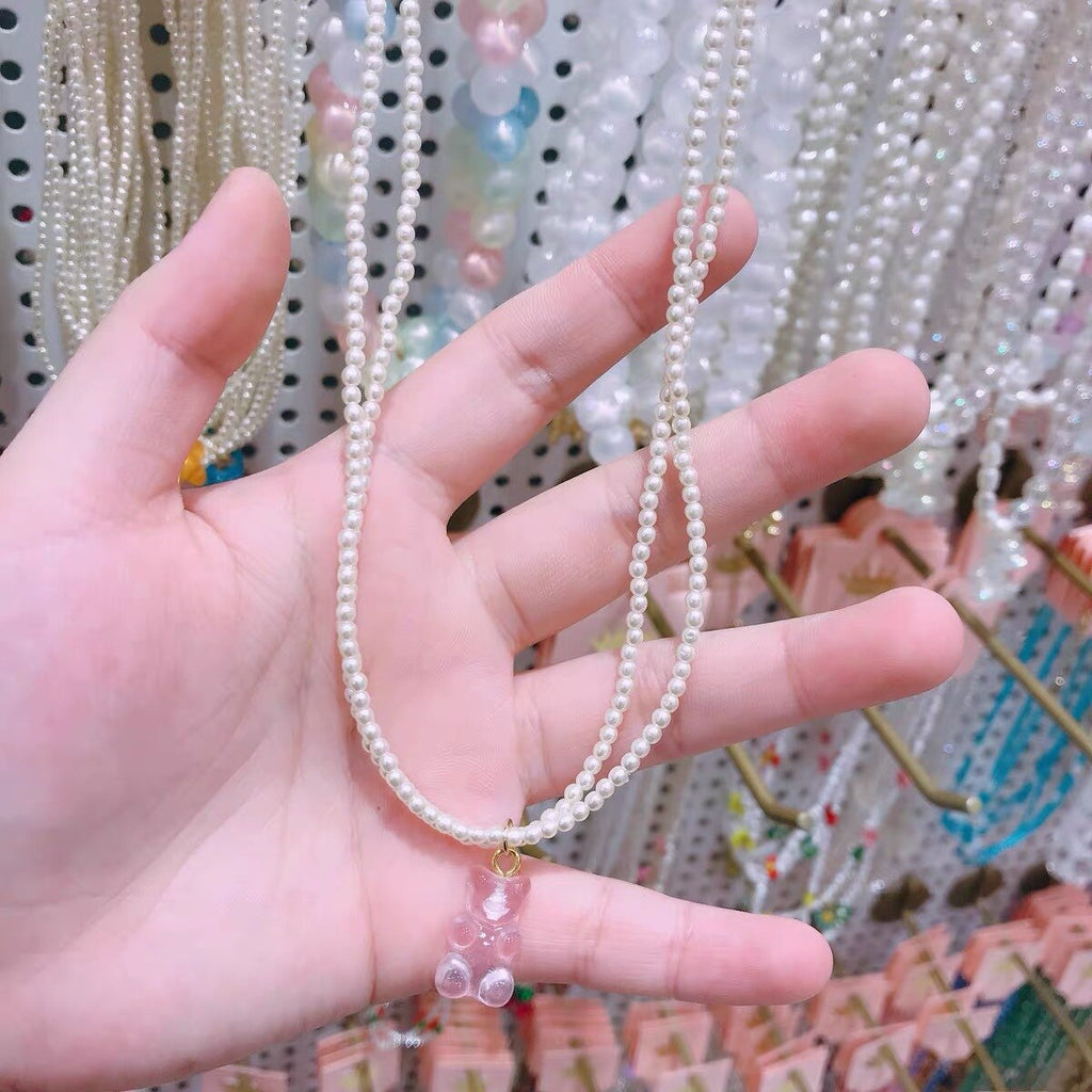 Trendy Double Layer Imitation Pearl Transparent Bear Pendant Necklace For Women Girls Temperament Neck Jewelry