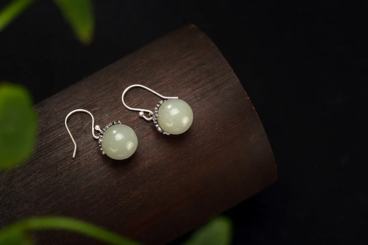 Real 925 Sterling Silver Natural Jade Balls Drop Earrings for Women Handmade Leaves Jewel Vintage Brincos Ethnic Bijoux