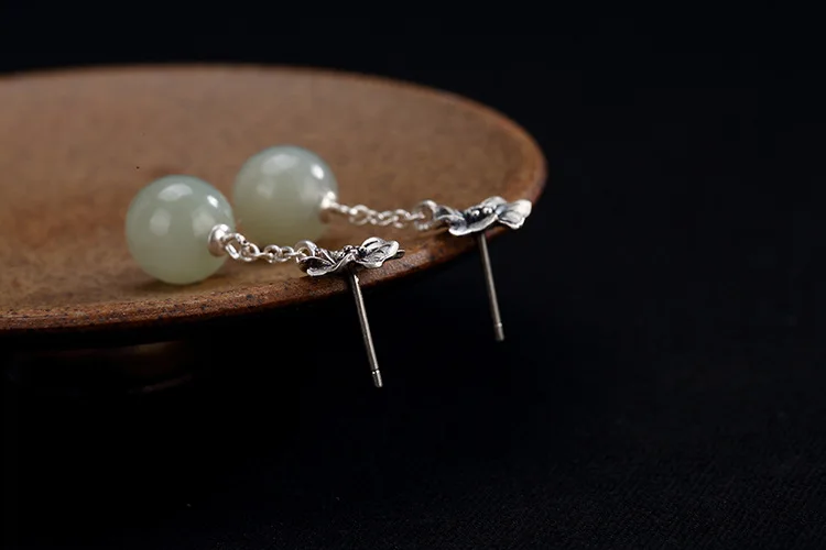 Real 925 Sterling Silver Natural Jade Beads Drop Earrings for Women Women Simple Vintage Flower Brincos Handmade Bijoux