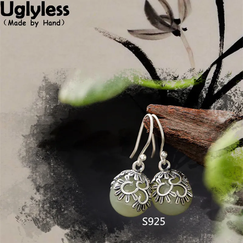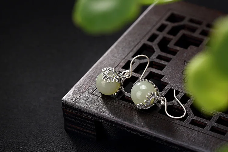 Real 925 Sterling Silver Natural White Jade Balls Drop Earrings Vintage Handmade Hollow Women Dress Brincos Fine Bijoux