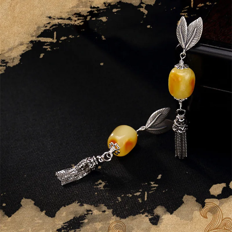 Real 925 Sterling Silver Nature Amber Women Vintage Tassels Drop Earrings Ethnic Handmade Leaves Brincos Beeswax Bijoux