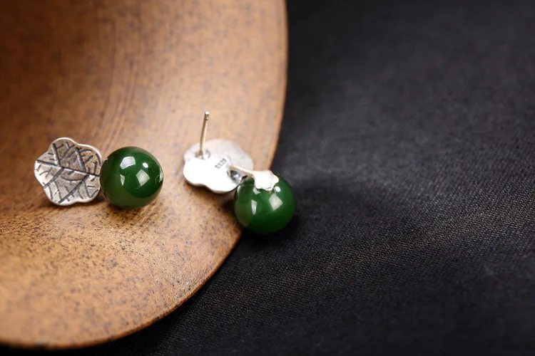 Real 925 Sterling Silver Nature Green Jade Balls Dangle Earrings Women Fine Jewelry Handmade Jasper Leaf Brincos Ethnic