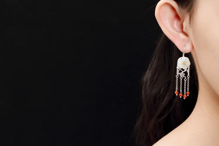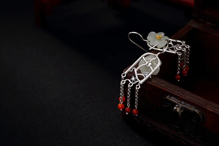 Real 925 Sterling Silver Nature White Jade Plum Flower Dangle Earrings Women Bohemia Ethnic Brincos Agate Beads Jewelry