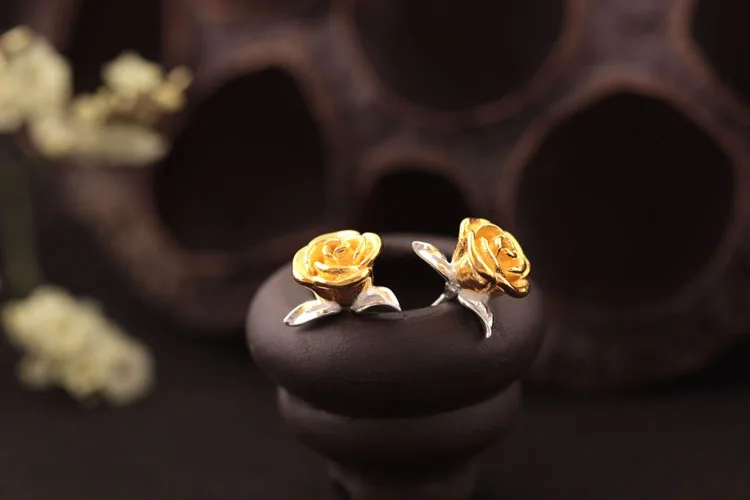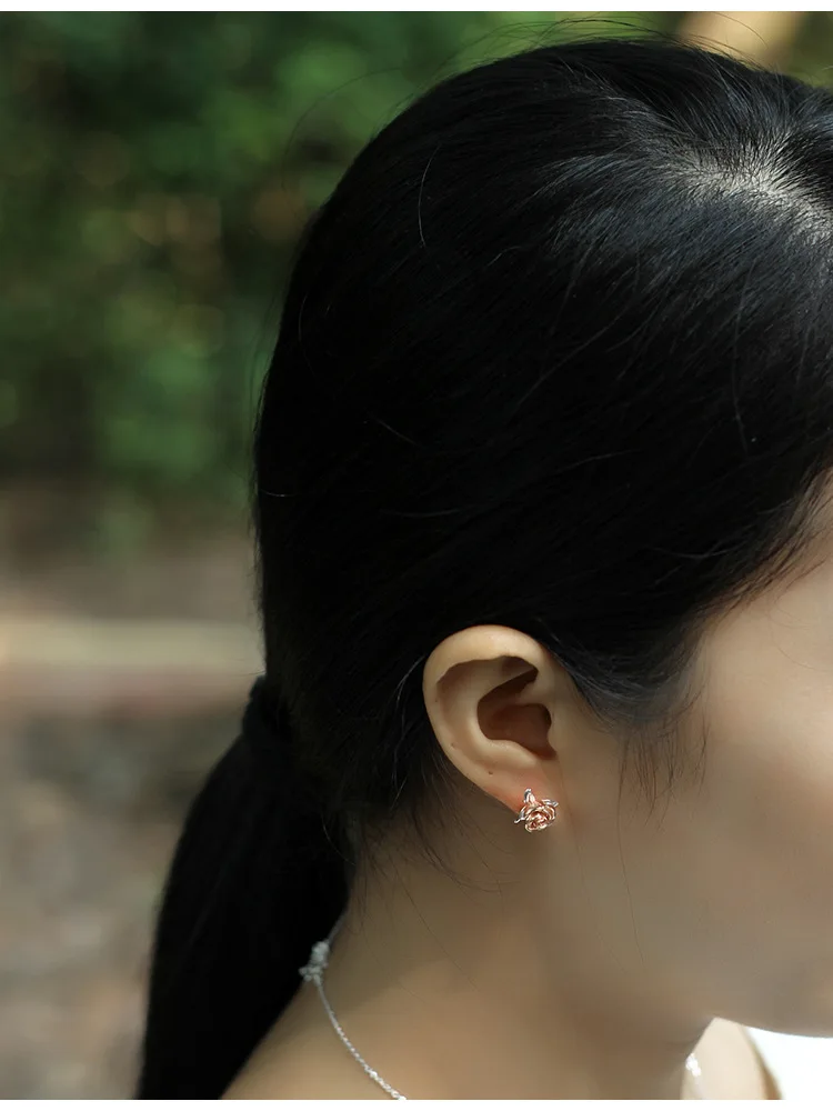 Real 925 Sterling Silver Rose Flower Stud Earrings Handmade Delicate Women Floral Studs Designer Vintage Brincos Bijoux