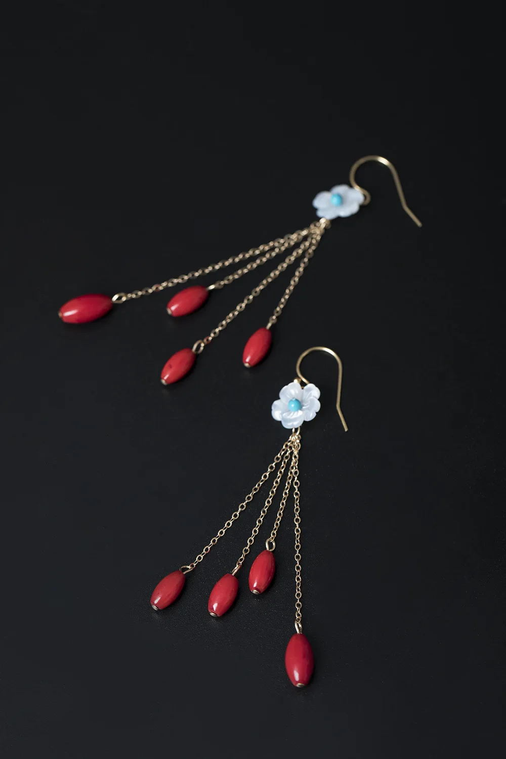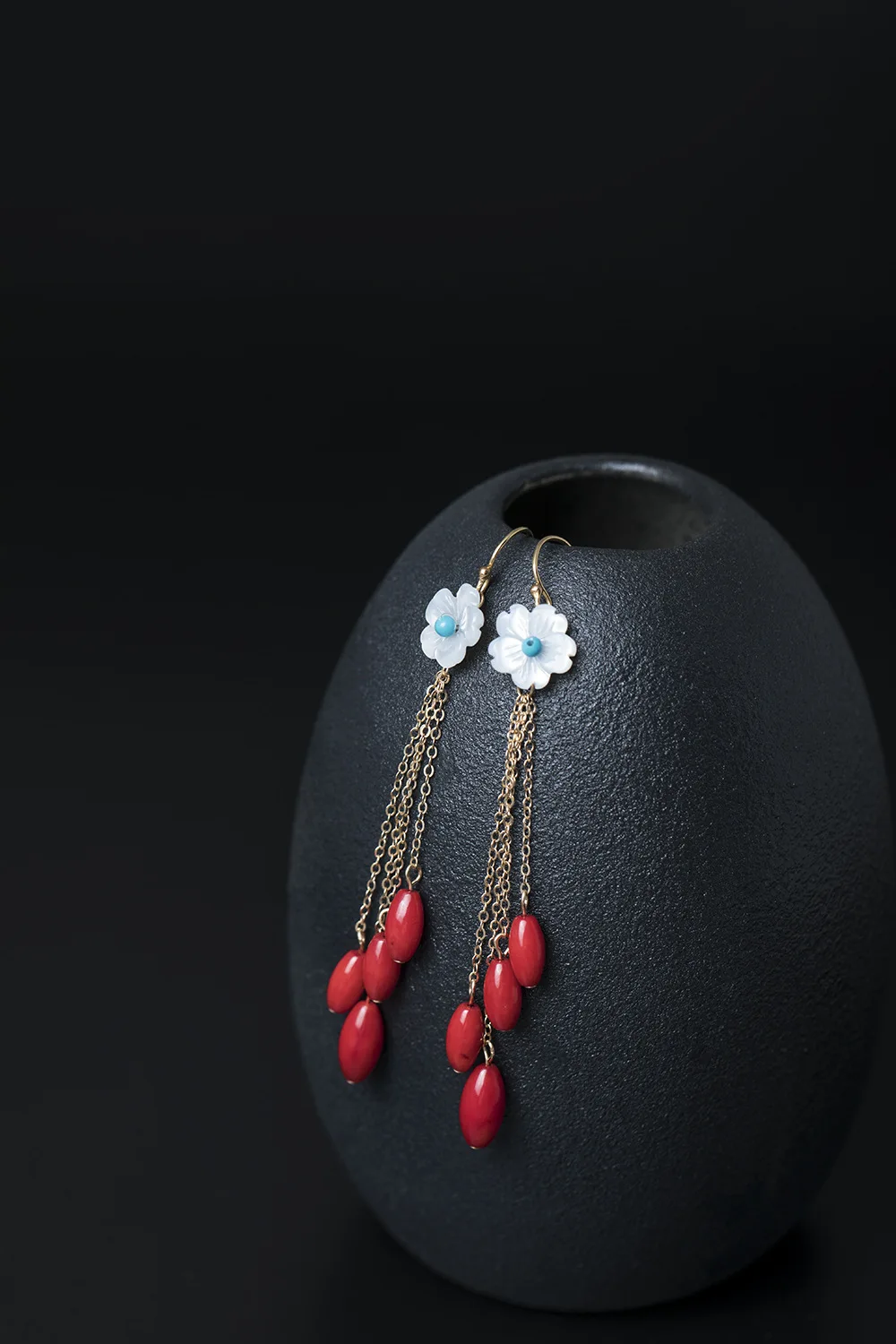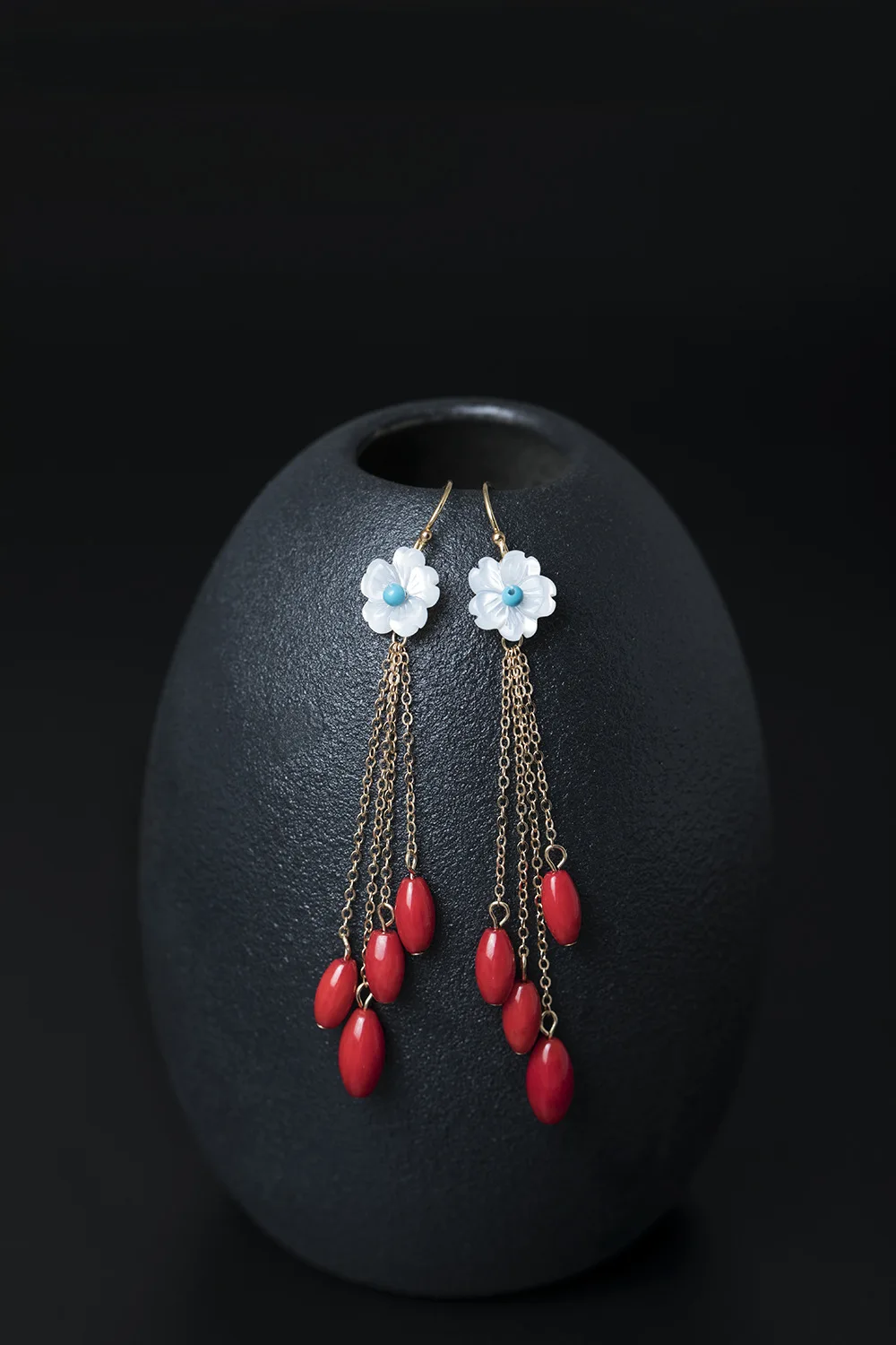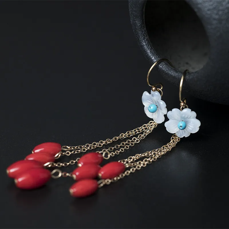 Real 925 Sterling Silver Women Nature Shell Flower Earrings Exotic Bohemian Red Beads Earrings Turquoise Brincos Bijoux