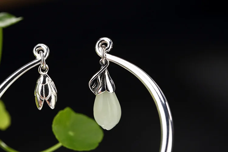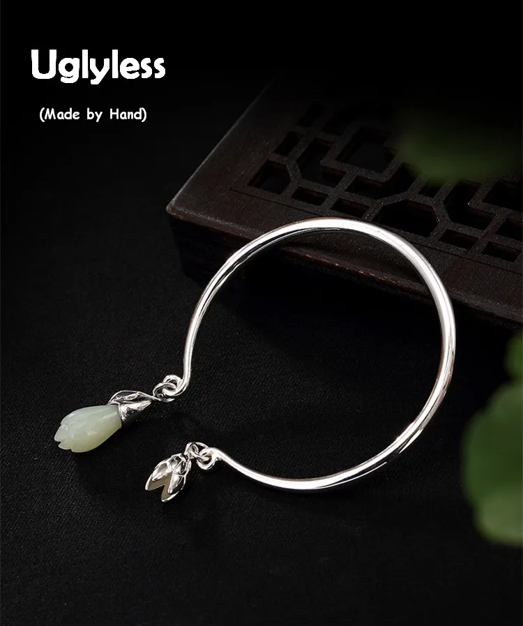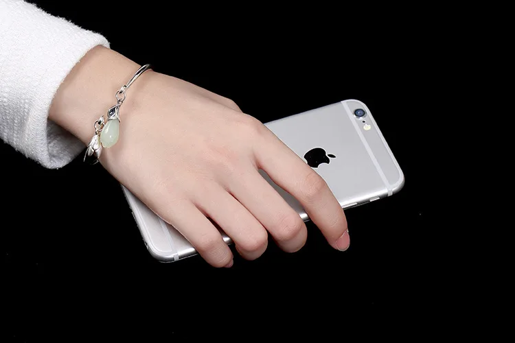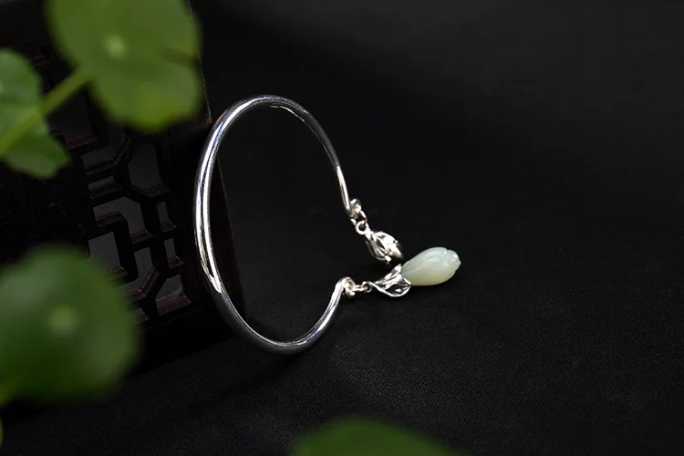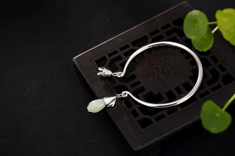 Real 990 Fine Silver Jewelry Vintage Ethnic Charms Bangles for Women Luxury Natural Jade Magnolia Bangle Tassel Bijoux