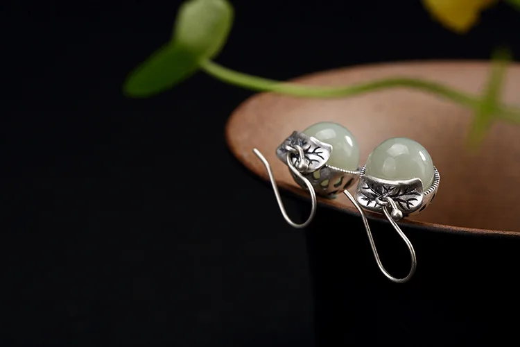 Real 990 Fine Silver Women Vintage Jewelry Handmade Leaf Dangle Earrings Natural White Jade Ball Brincos Hollow Bijoux