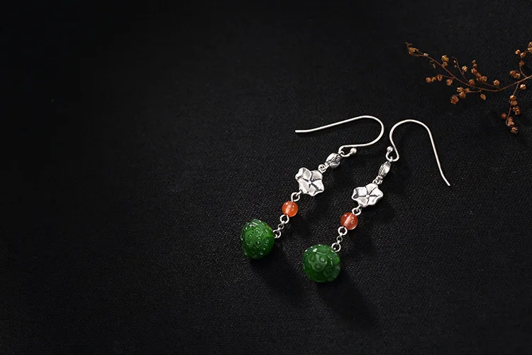 Real S 925 Sterling Silver Natural Jade Women Lotus Earrings Handmade Jasper Flower Brincos Vintage Ethnic Fine Bijoux