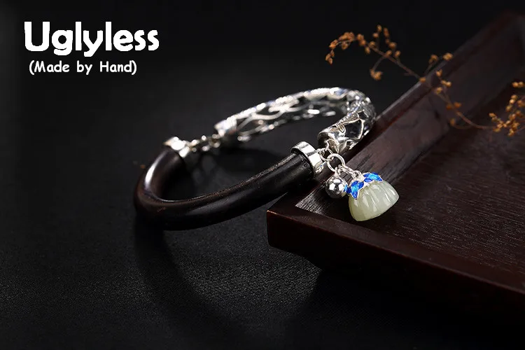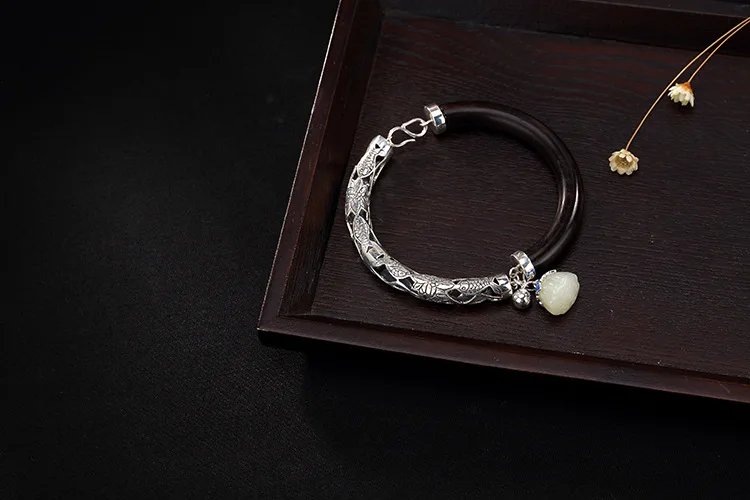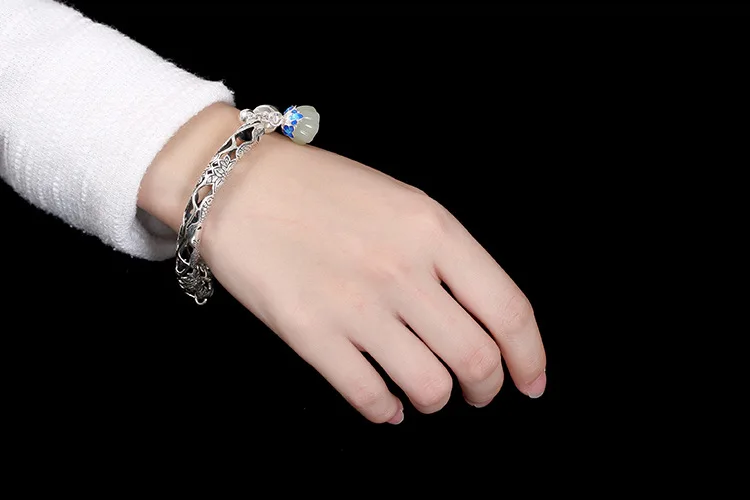 S 925 Sterling Silver Bangles Ethnic Hollow Bangle Women Sandalwood Fine Jewelry Retro Enamel Jade Lotus Charms Bijoux