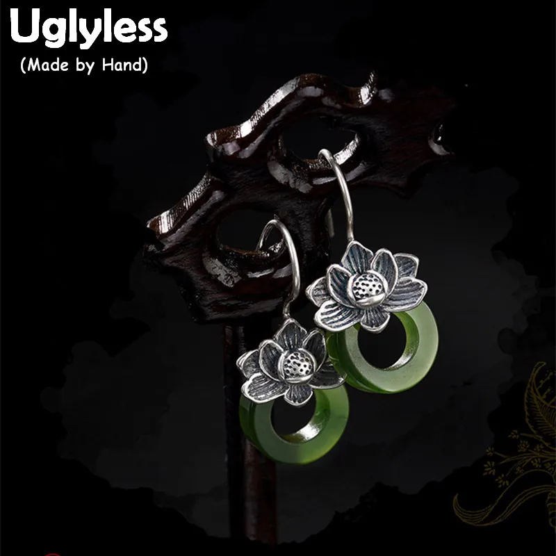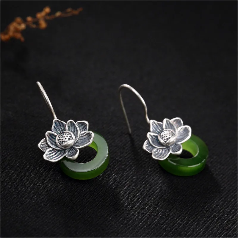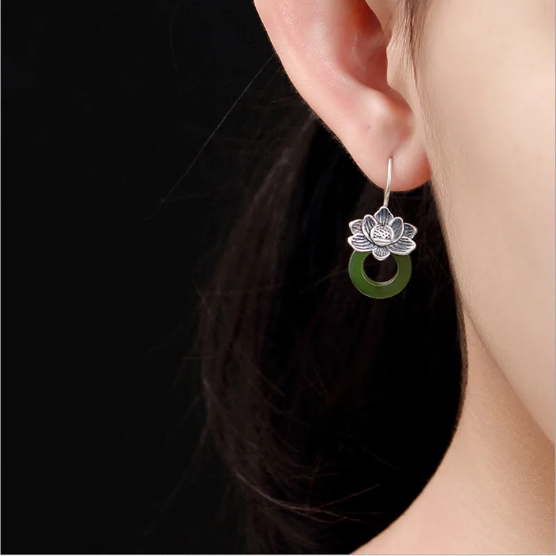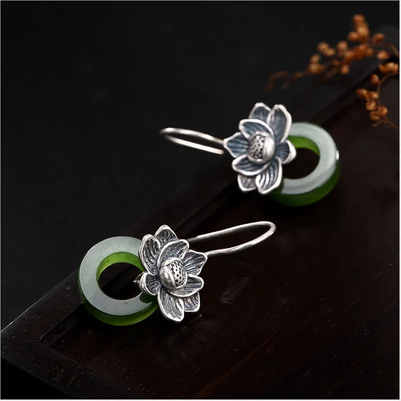 S 925 Sterling Silver Natural Green Jade Circle Earrings for Women Vintage Ethnic Lotus Brincos Handmade Jasper Bijoux