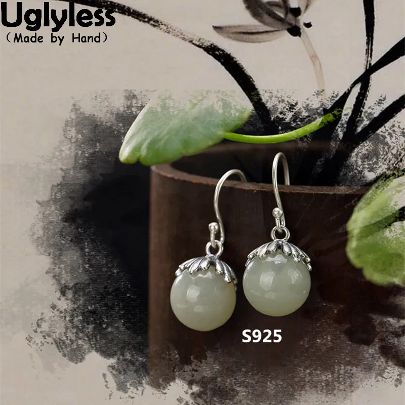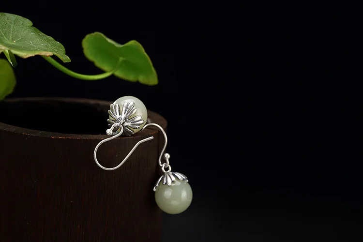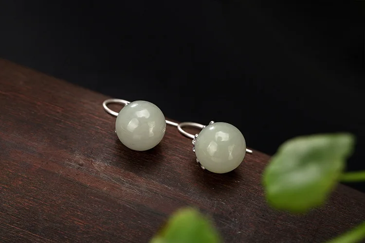 S 925 Sterling Silver Natural Jade Ball Drop Earrings Women Ethnic Jewelr Elegant Statement Brincos Retro Ethnic Bijoux