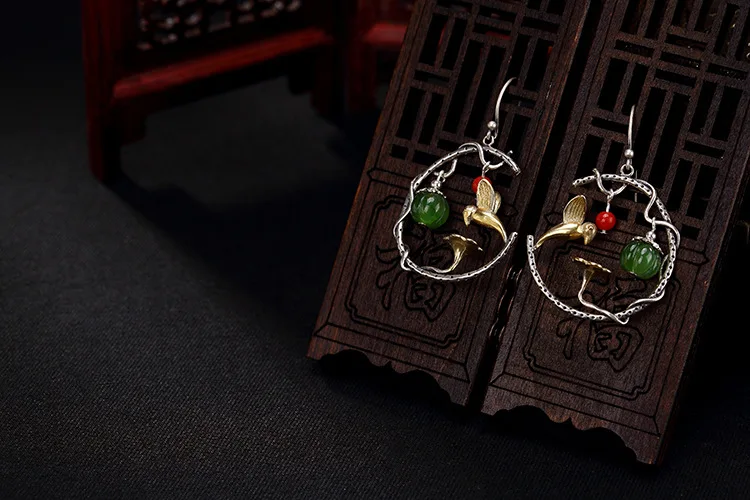 S 925 Sterling Silver Nature Jasper Lotus Women Earrings Handmade Bird Brincos Ethnic Vintage Fine Jewelry Beads Bijoux