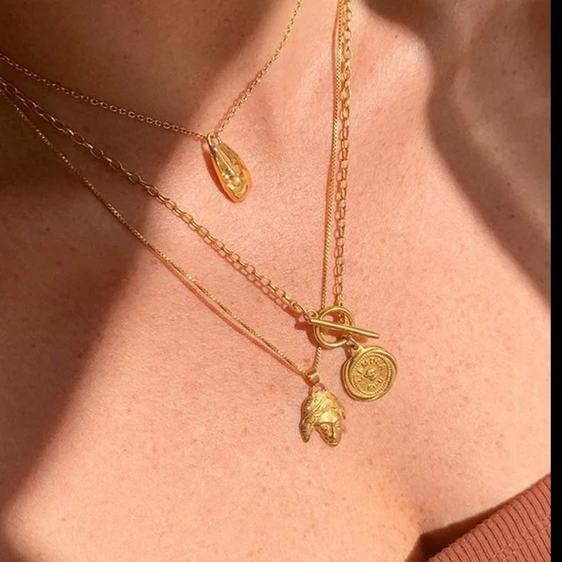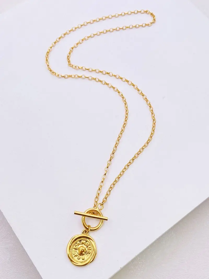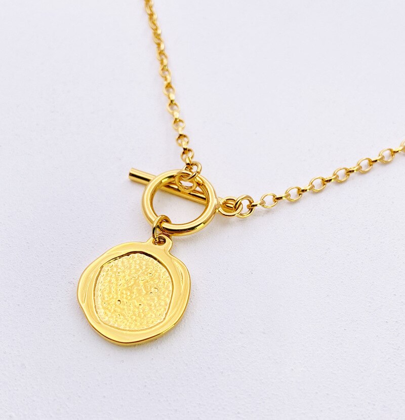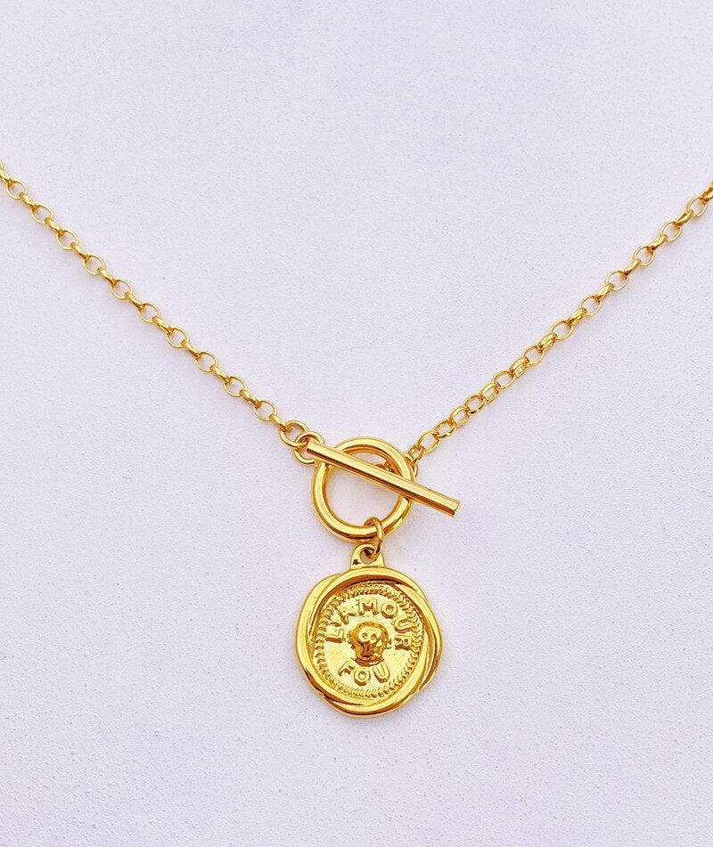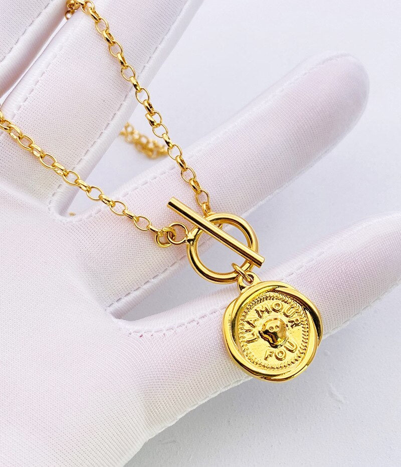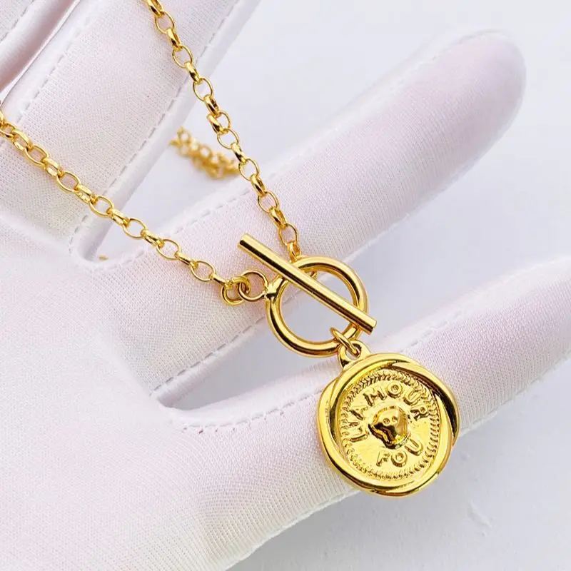 Unisex Punk style metal coin chain necklace gold plated brass shiny choker