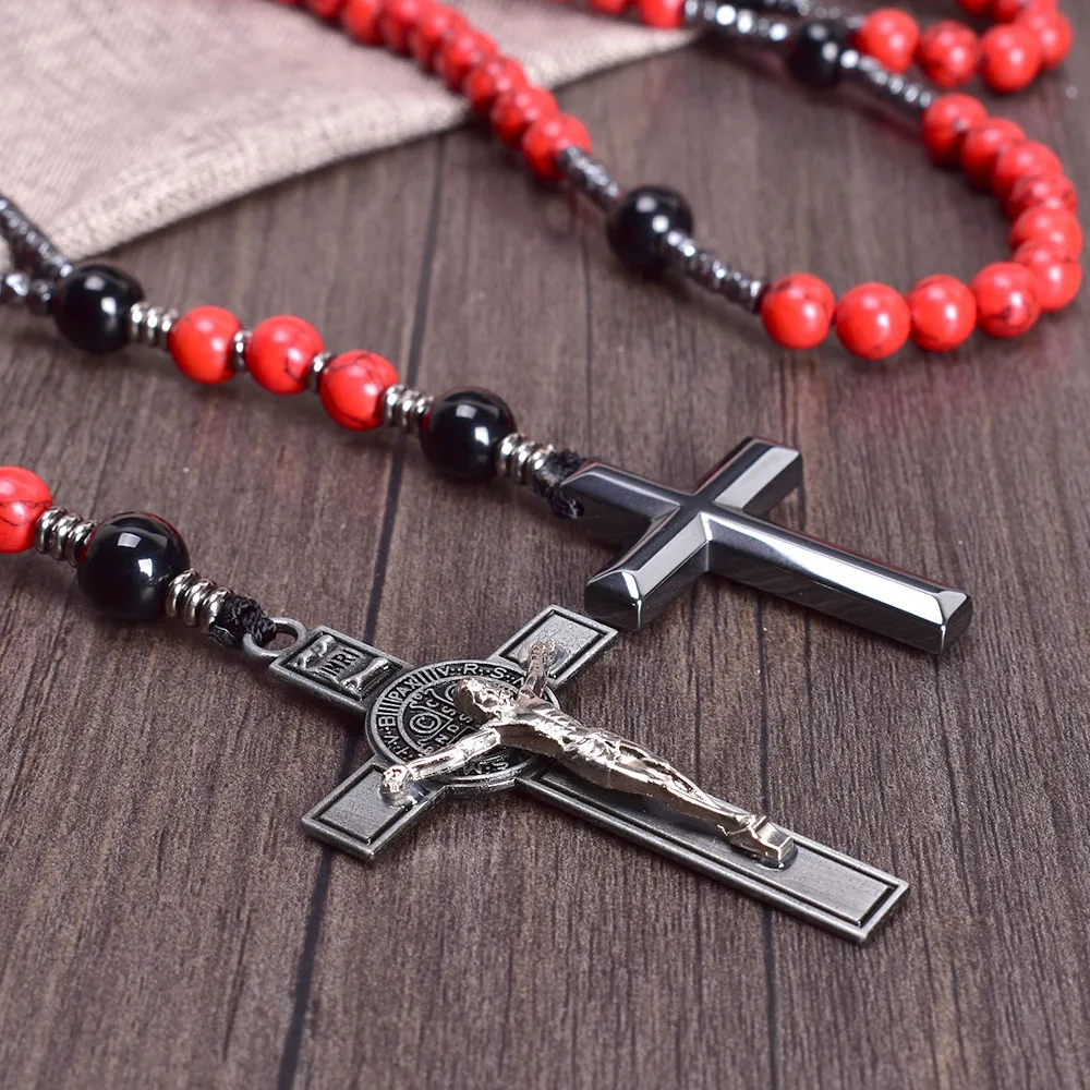 Vintage 8mm Red Pine Stone Christ Rosary Necklaces Hematite Cross Pendant Necklace for Men Women Jewelry