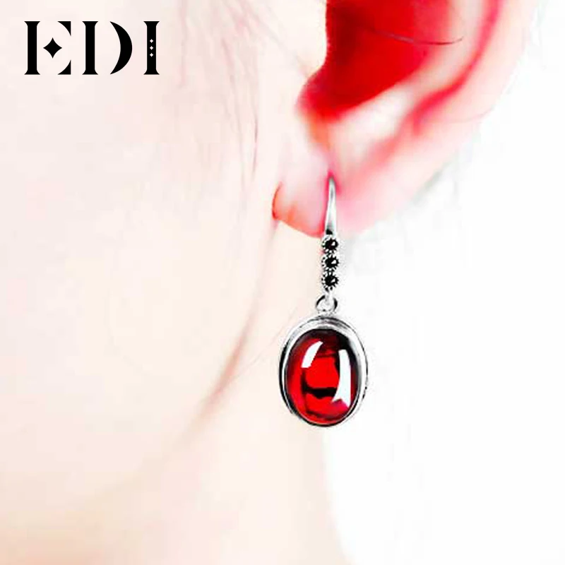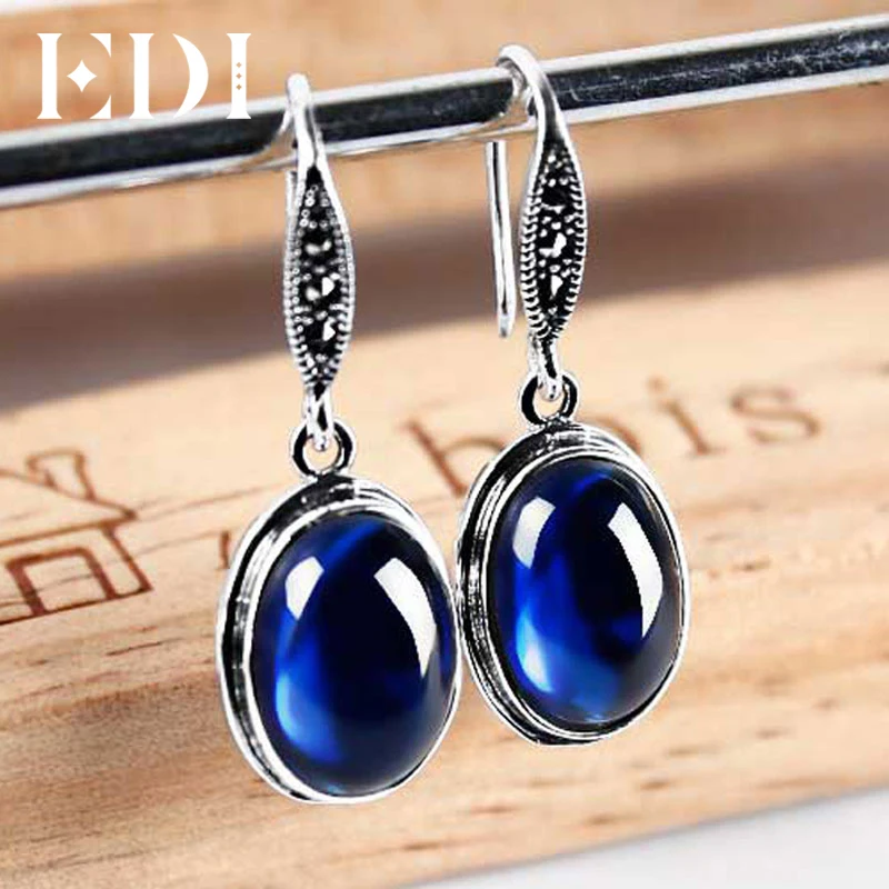 Trendy Women Vintage 925-Sterling-Silver Dangle Earrings Blue Precious Stone Drop Oval Luxury Thai Silver Earring EH100L