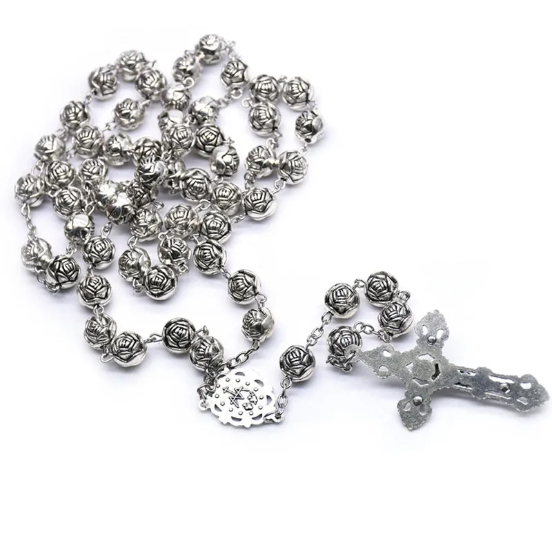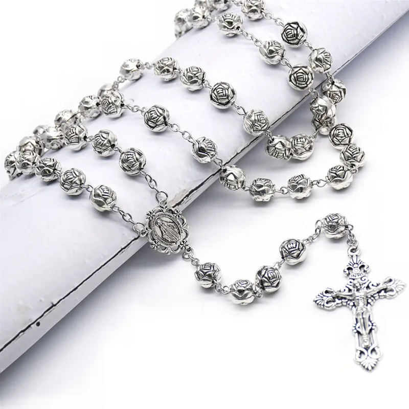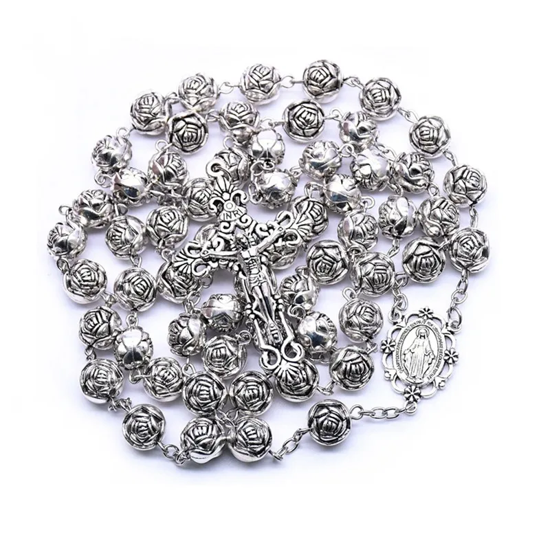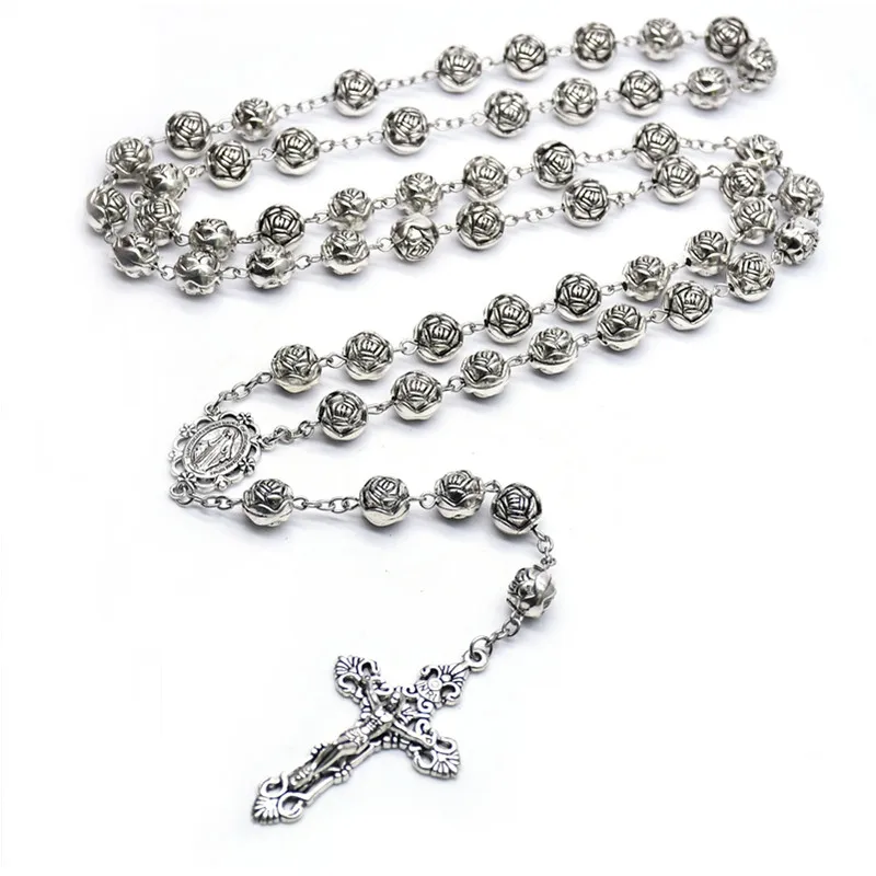 Vintage Cross Women Rosary Necklace Accessories Rose Flower Religious Necklace For Wedding Ladies